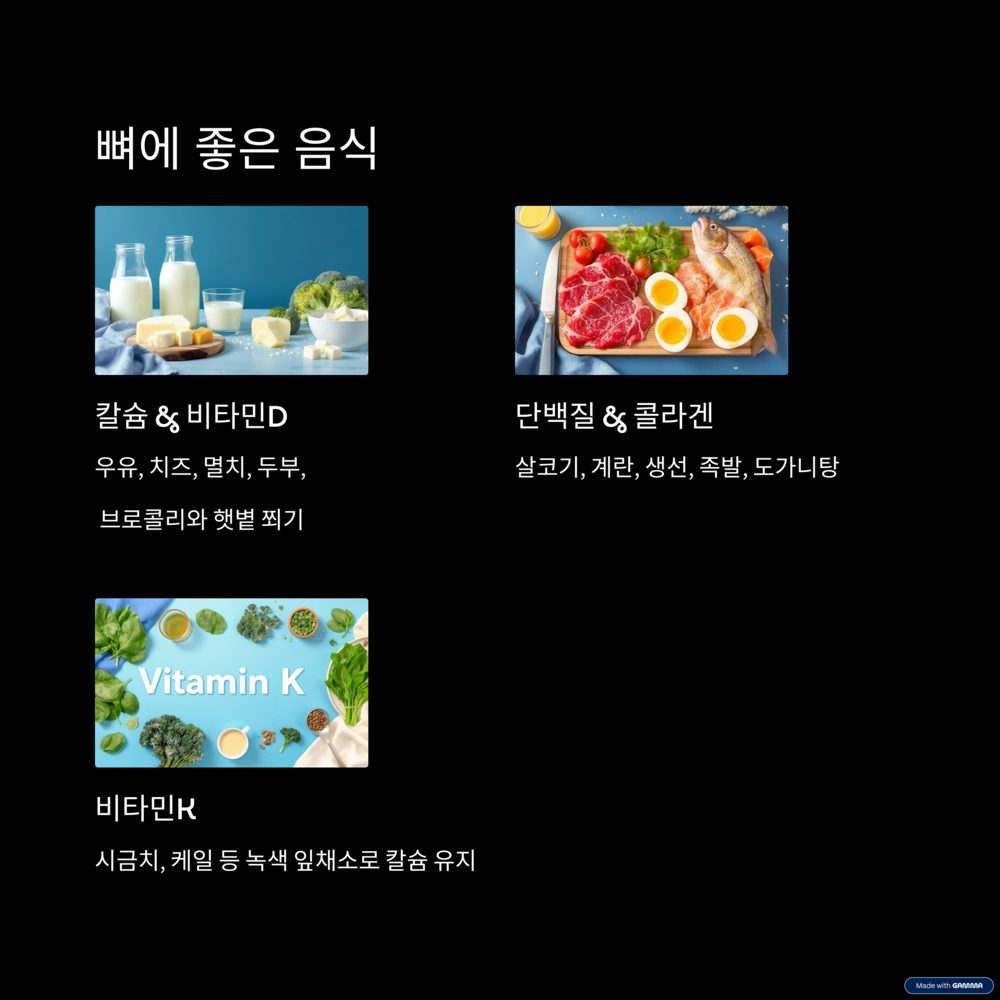 뼈의 주재료인 칼슘과 그 흡수를 돕는 비타민D는 환상의 짝꿍이에요. 우유, 치즈, 멸치, 두부, 브로콜리 등을 챙겨 드시고, 낮에 가벼운 산책으로 햇볕을 쬐어주세요.