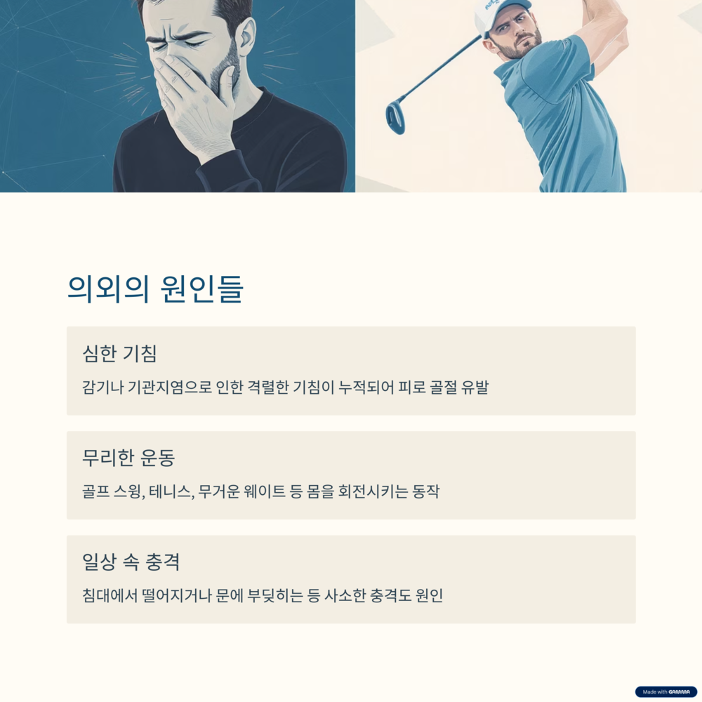 갈비뼈에 금이 갔다고 하면 보통 교통사고나 넘어지는 등의 큰 충격을 생각하시죠? 물론 직접적인 타격이 가장 흔한 원인이지만, 생각보다 정말 사소하고 의외의 상황에서 갈비뼈는 우리를 배신하곤 한답니다.