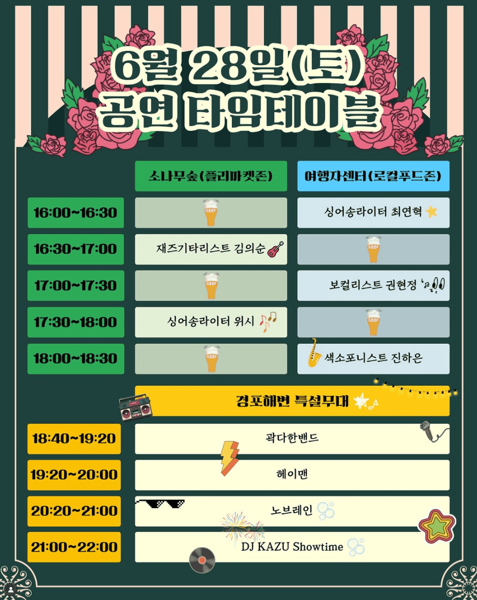 공식 인스타그램(@gn_gbbf)에서 매일의 라인업을 미리 확인하고 좋아하는 아티스트의 공연을 챙겨보는 센스! 또한, 맥주를 마시며 참여할 수 있는 맥주 올림픽 같은 유쾌한 이벤트도 준비되어 있어요.