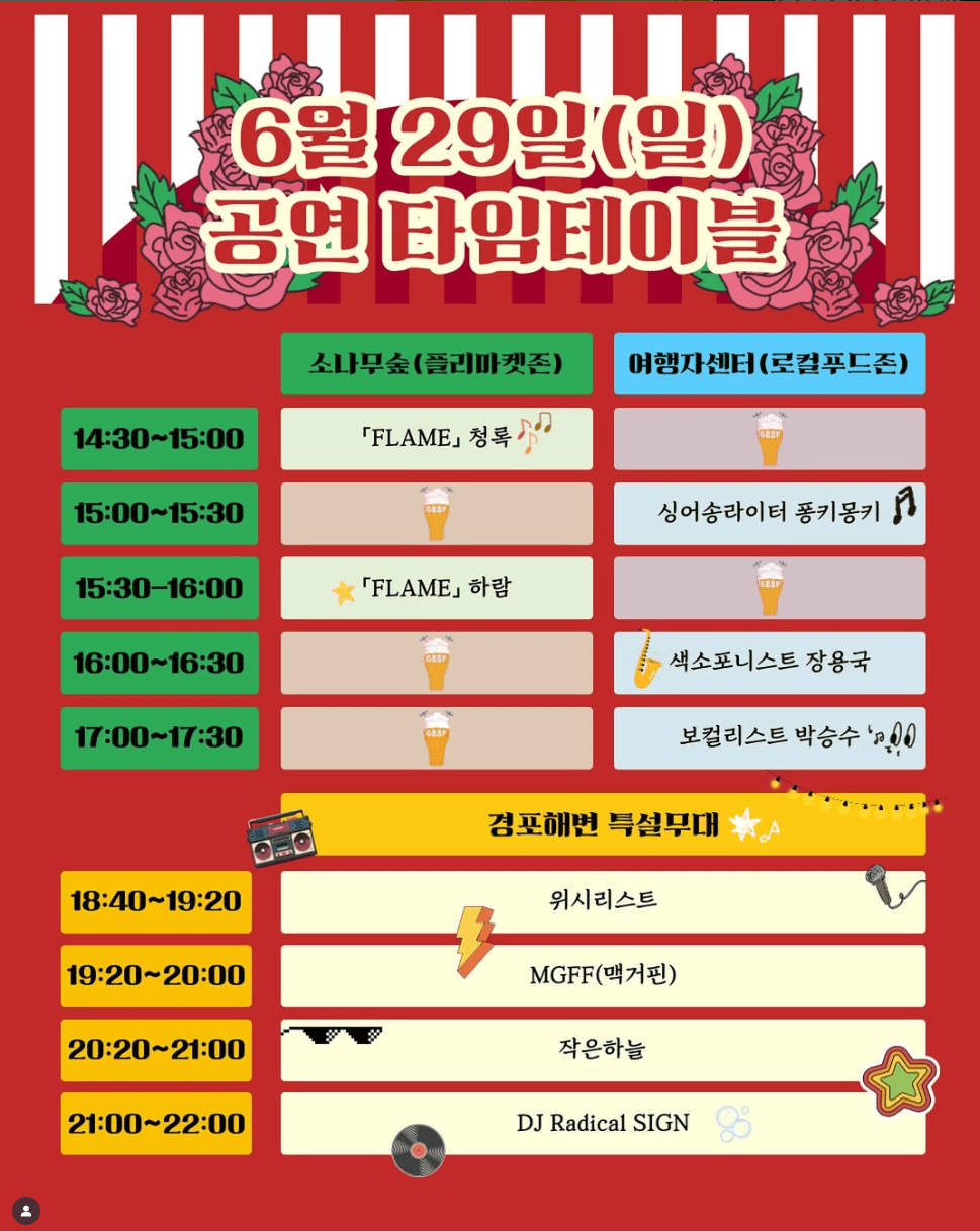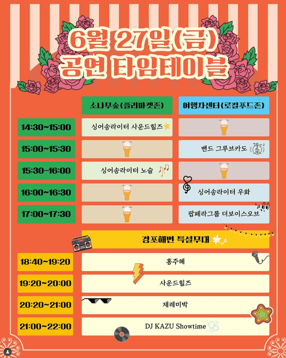 공식 인스타그램(@gn_gbbf)에서 매일의 라인업을 미리 확인하고 좋아하는 아티스트의 공연을 챙겨보는 센스! 또한, 맥주를 마시며 참여할 수 있는 맥주 올림픽 같은 유쾌한 이벤트도 준비되어 있어요.