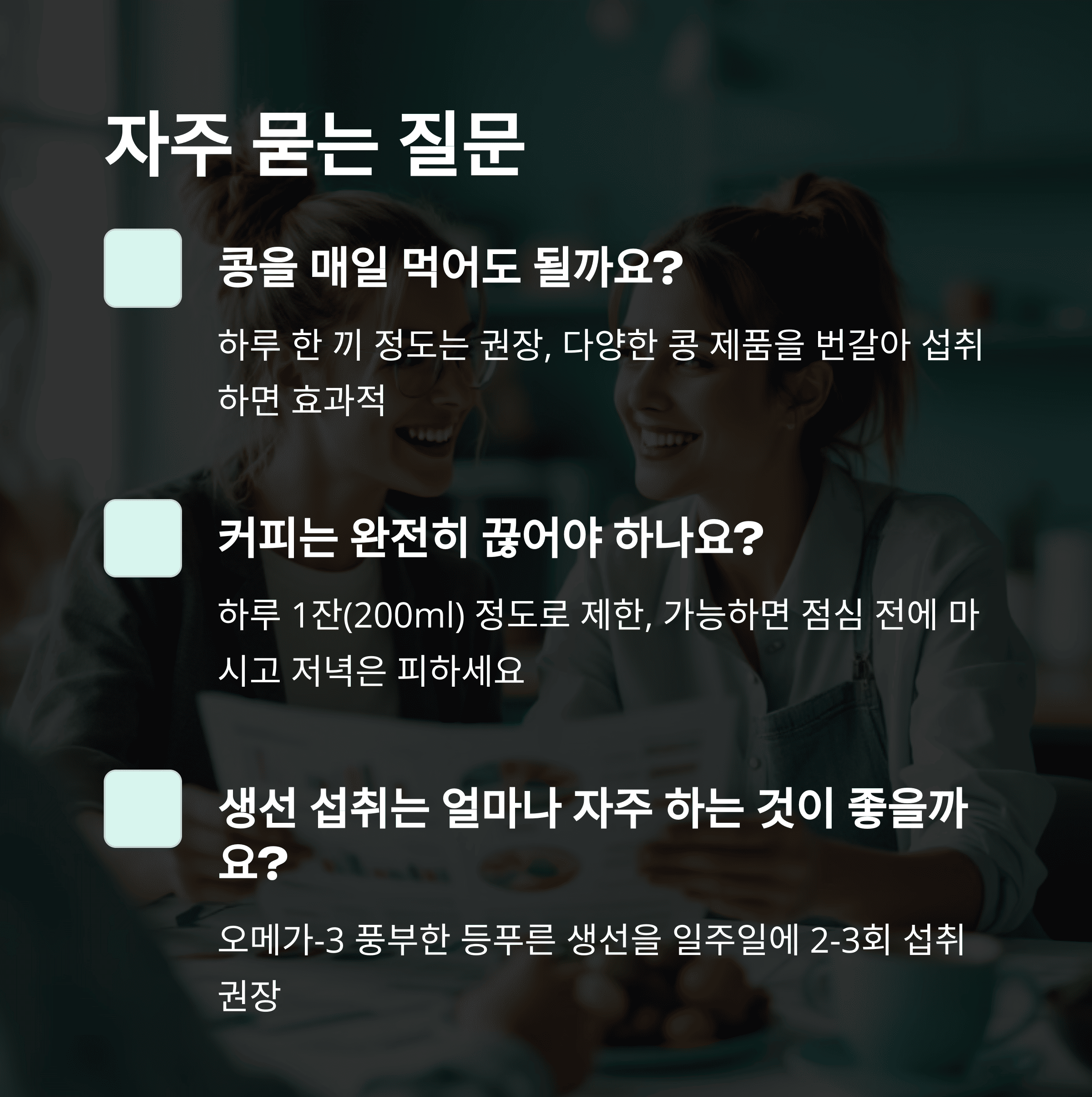 A: 네, 하루 한 끼 정도는 권장됩니다. 다양한 콩 제품(두부, 된장, 청국장, 콩나물 등)을 번갈아 섭취하면 더욱 효과적입니다.