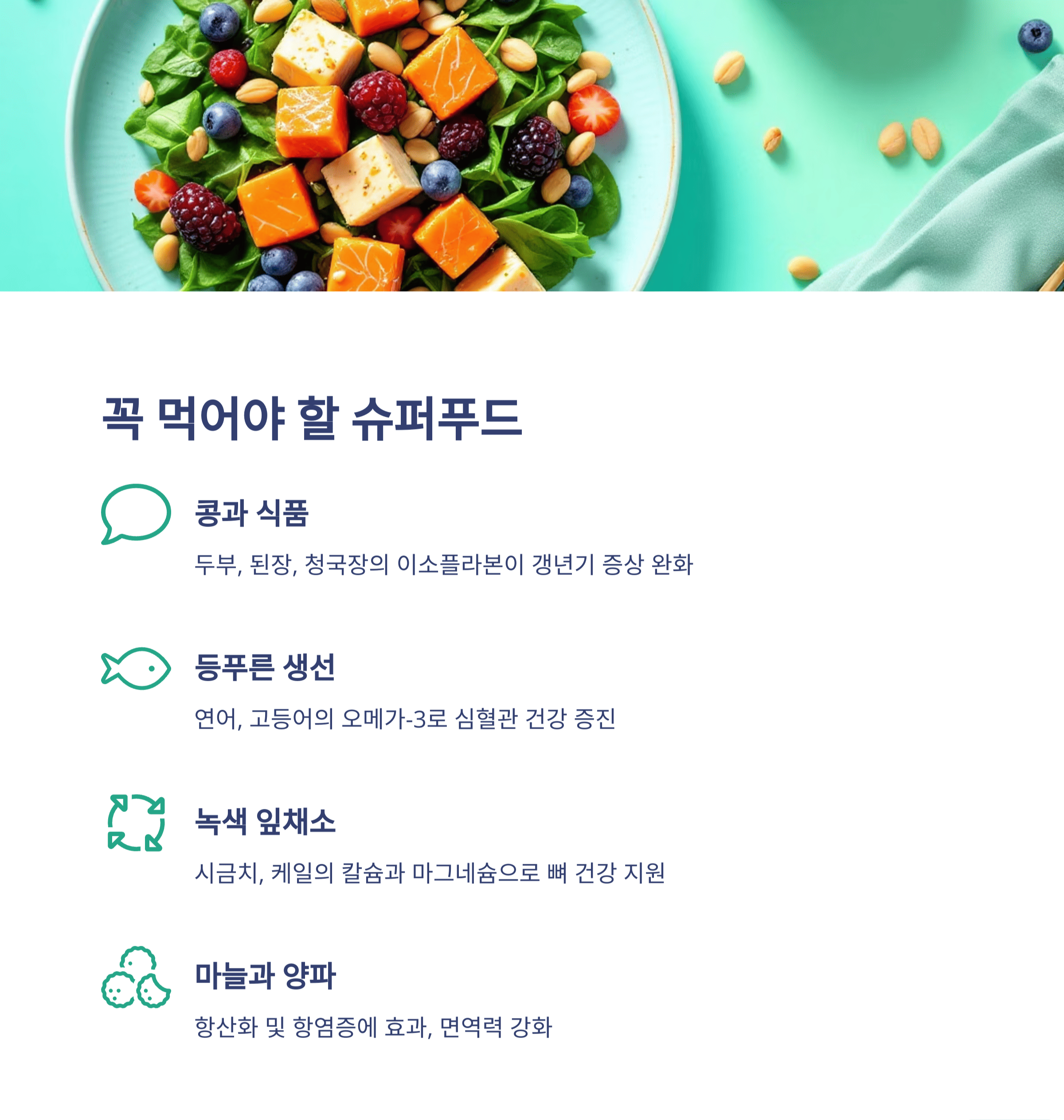 갱년기 증상 완화와 전반적인 건강 증진을 위해 다음 10가지 슈퍼푸드를 식단에 정기적으로 포함시키는 것이 좋습니다: