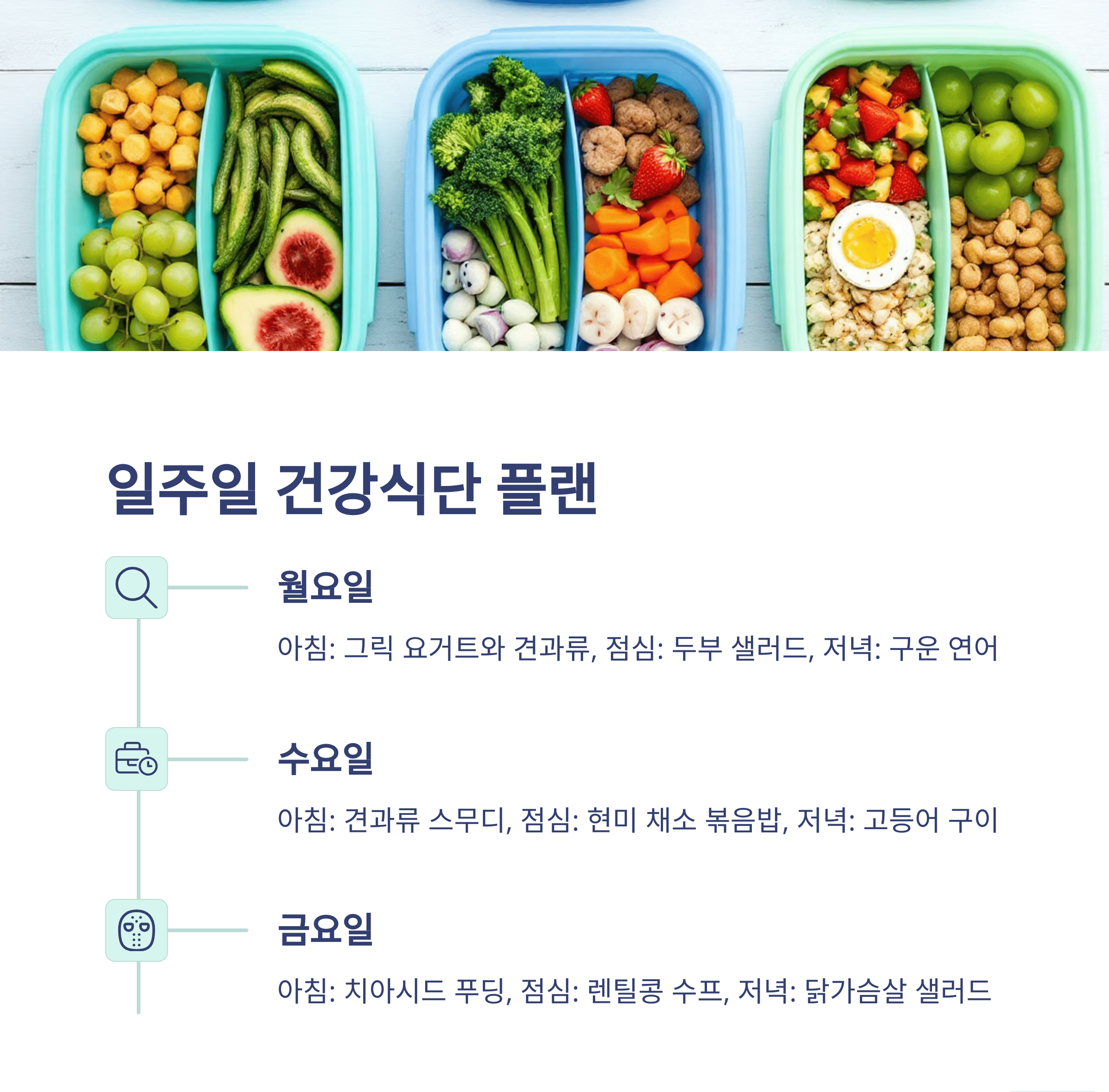 - 섭취 권장: 식이섬유가 풍부한 채소와 과일, 단백질(생선, 두부, 계란)