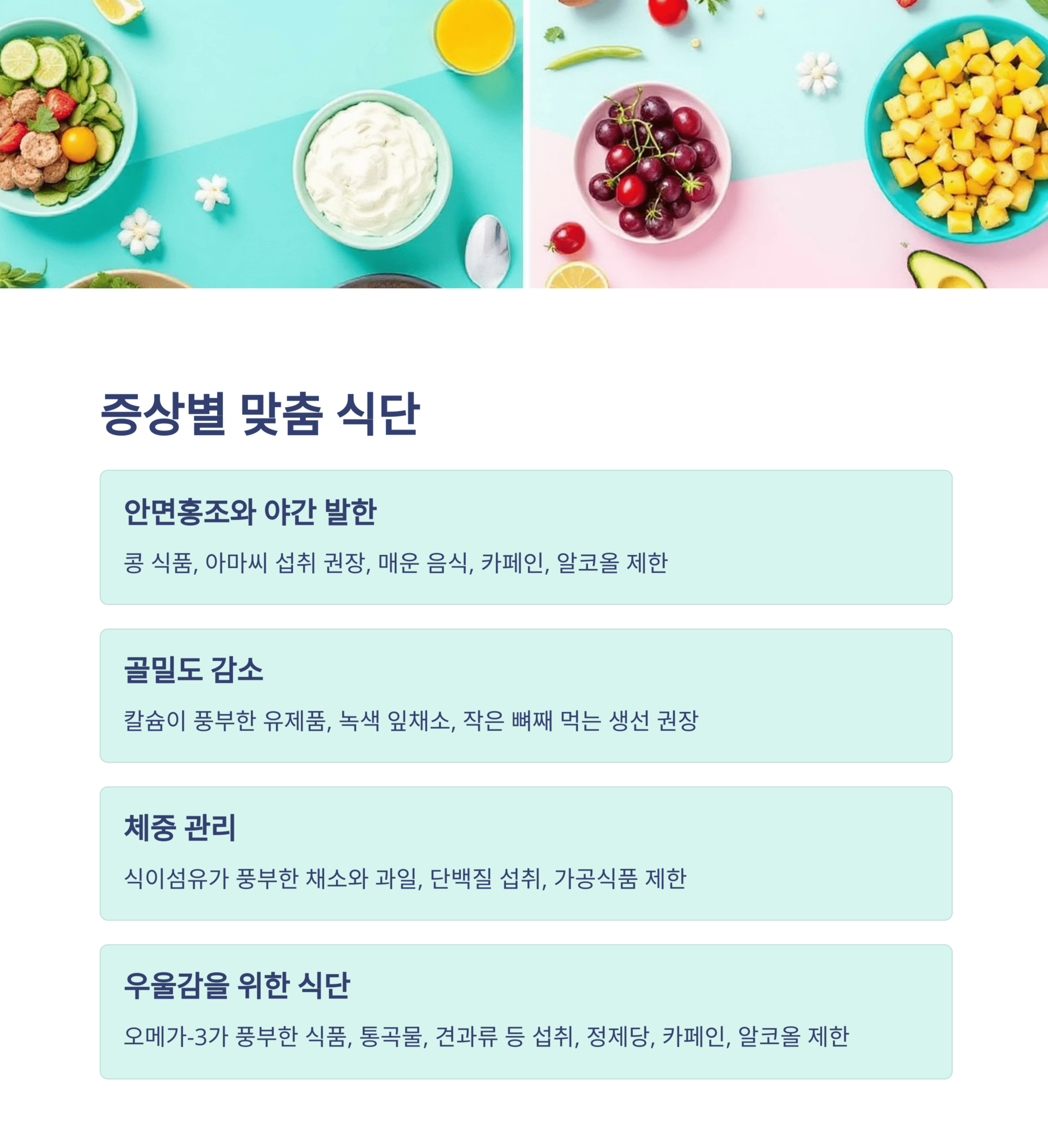 갱년기의 다양한 증상에 따라 맞춤형으로 식단을 구성하는 방법을 알아봅시다: