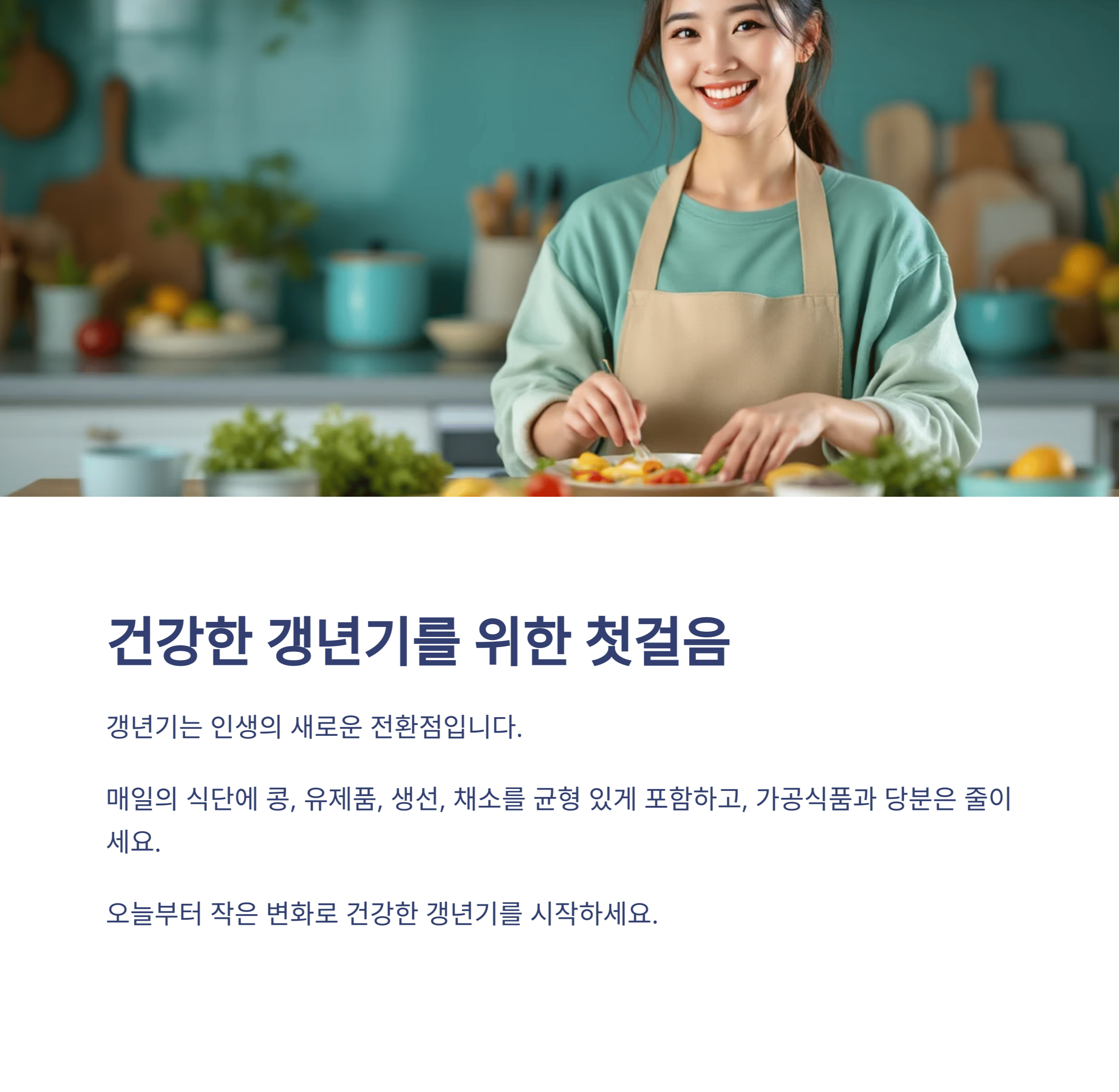 여러분의 몸은 여러분이 먹는 음식으로 만들어집니다. 오늘부터 조금씩 식습관을 바꿔보는 건 어떨까요? 건강한 갱년기를 위한 식단 변화는 작은 실천에서 시작됩니다.