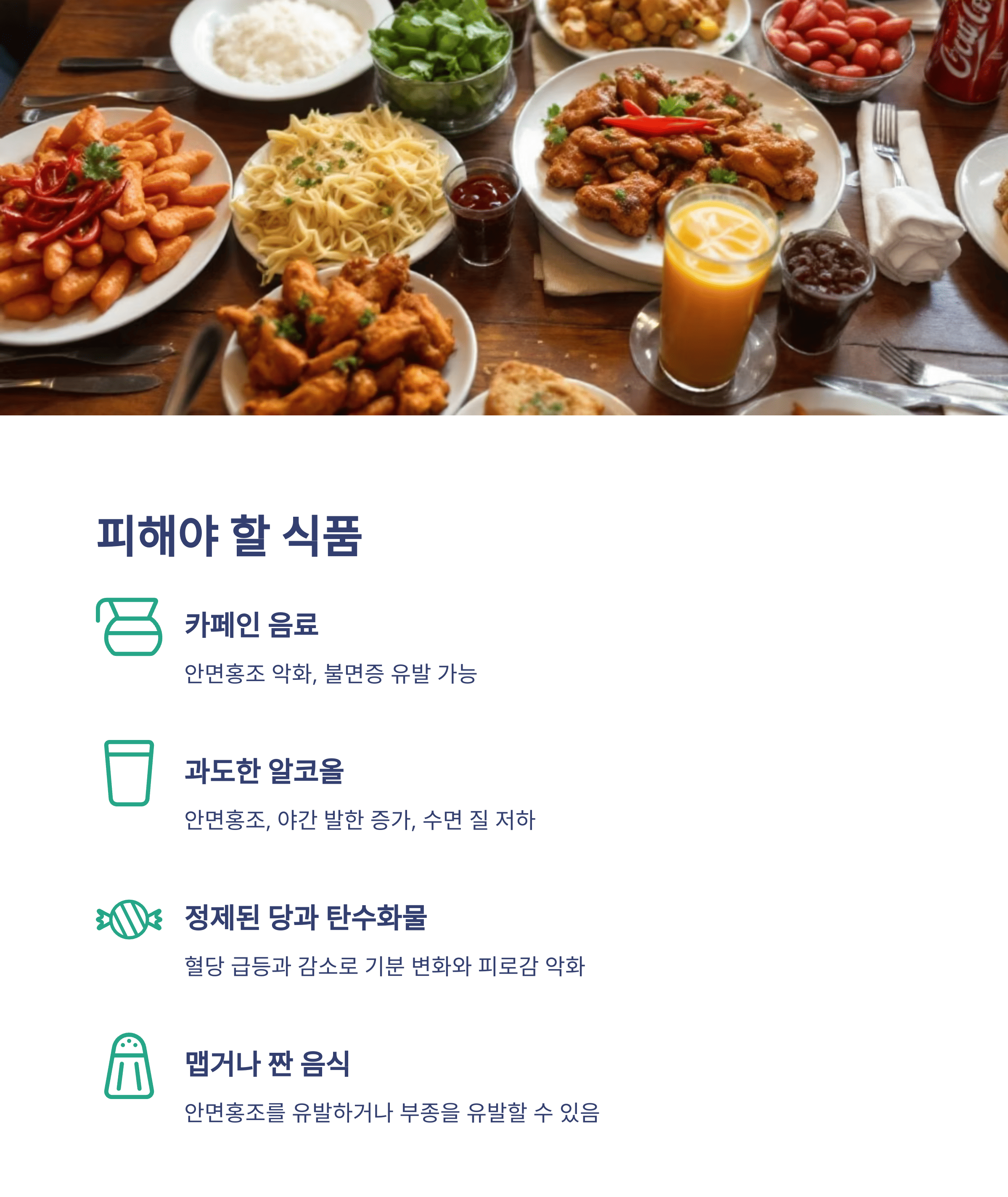 - 제한 필요: 나트륨이 많은 식품, 탄산음료