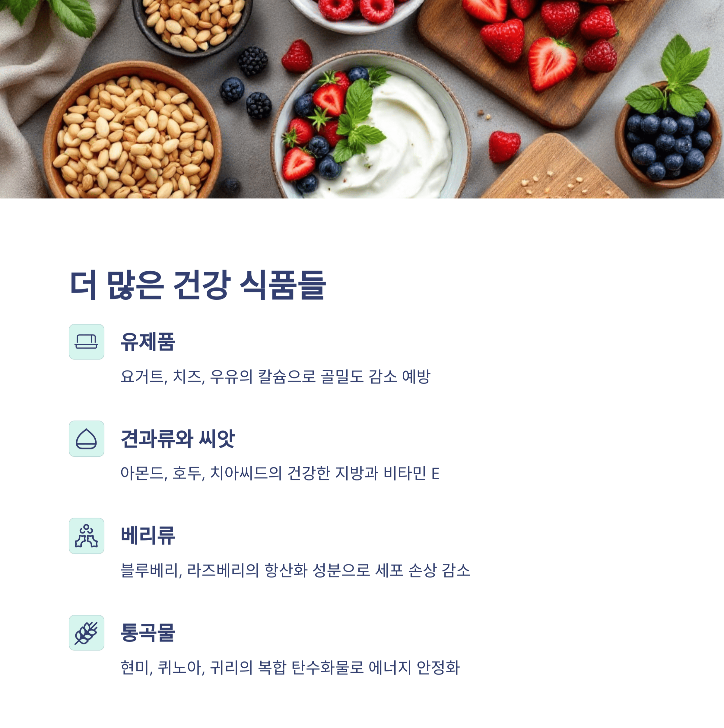 칼슘이 풍부한 유제품은 갱년기에 급격히 진행될 수 있는 골밀도 감소를 예방하는 데 중요합니다. 가능하면 저지방 유제품을 선택하세요.