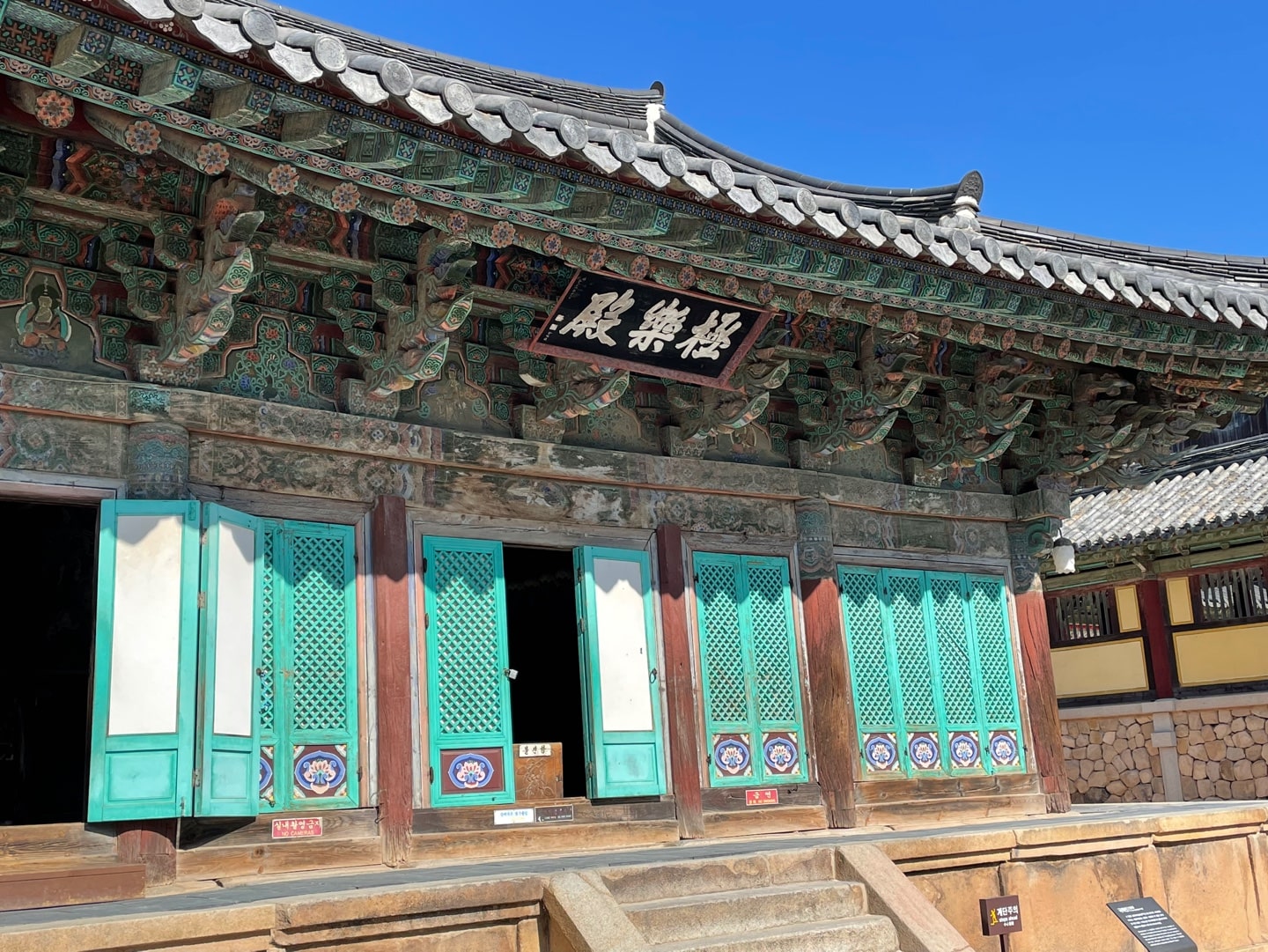 그리고 극락전 앞에 황금돼지상이 있는데 복을 기원하면서 만지는 사람들이 많이 있습니다. 하지만 진짜 돼지는 바로 극락전 현판 뒤에 숨어있답니다. 이 황금돼지는 2007년쯤 발견하여 누구나 쉽게 만질 수 있도록 극락전 앞에 황금돼지상을 설치했다고 합니다. 그 밖에도 비로전, 나한전 등 전각이 많이 있습니다. 그리고 역시 보물로 지정되어 있는 사리탑이 있는데 이는 일본으로 불법 반출되었다가 반환되었다고 하며 안쪽에 사리를 안치하는 구멍이 확인되었습니다.