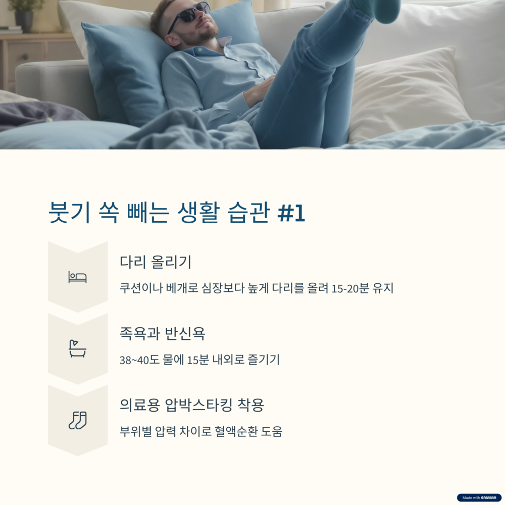 질병이 원인이 아닌 일상적인 다리부종은 생활 습관 개선만으로도 충분히 좋아질 수 있어요. 오늘부터 바로 실천할 수 있는 붓기 빼는 꿀팁을 알려드릴게요.
