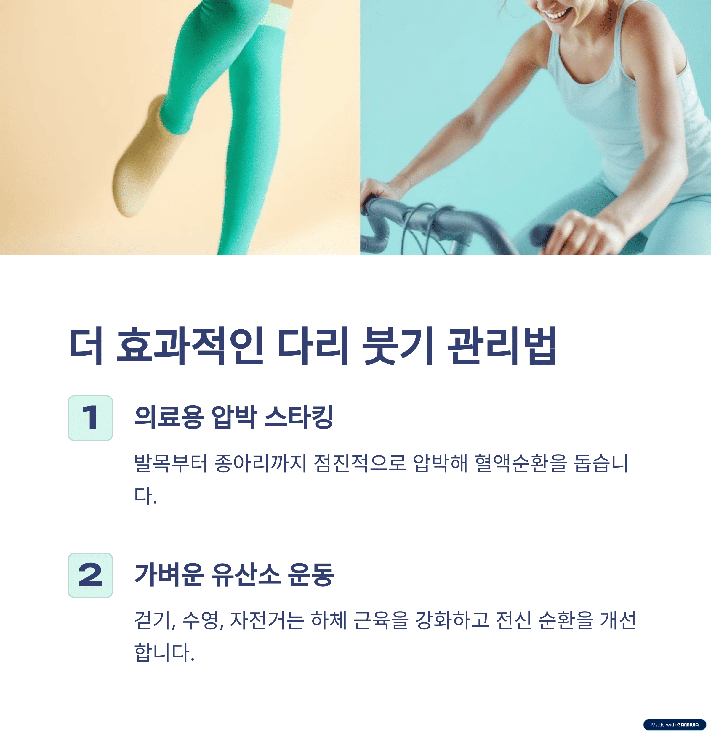 - 가벼운 유산소 운동: 걷기, 수영, 자전거 타기 등은 하체 근육을 강화하고 전신 순환을 개선하는 최고의 예방책입니다.