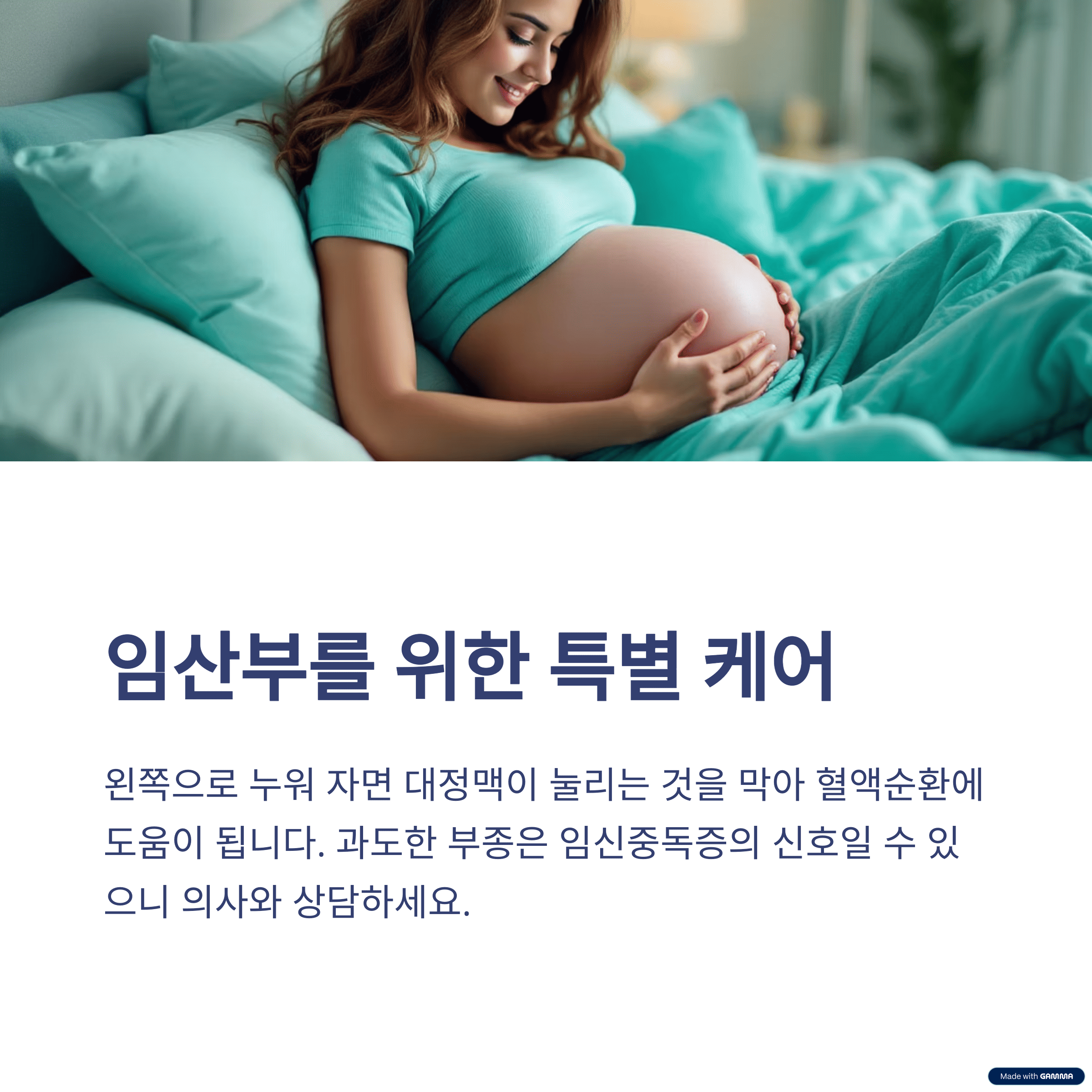 - 의사와 상담 필수: 과도하거나 갑작스러운 부종은 임신중독증의 신호일 수 있으니, 반드시 정기 검진 시 의사와 상담하세요.