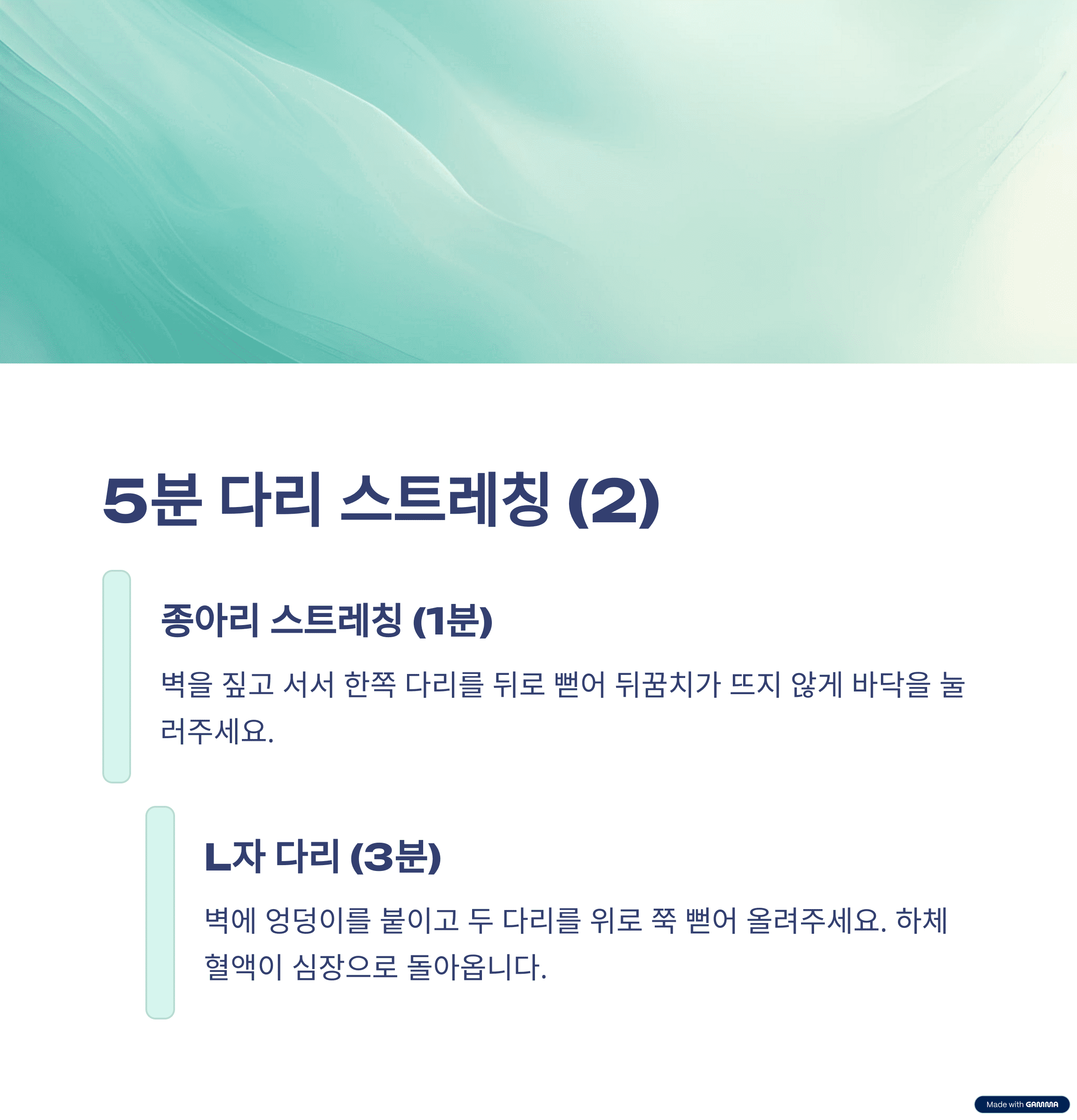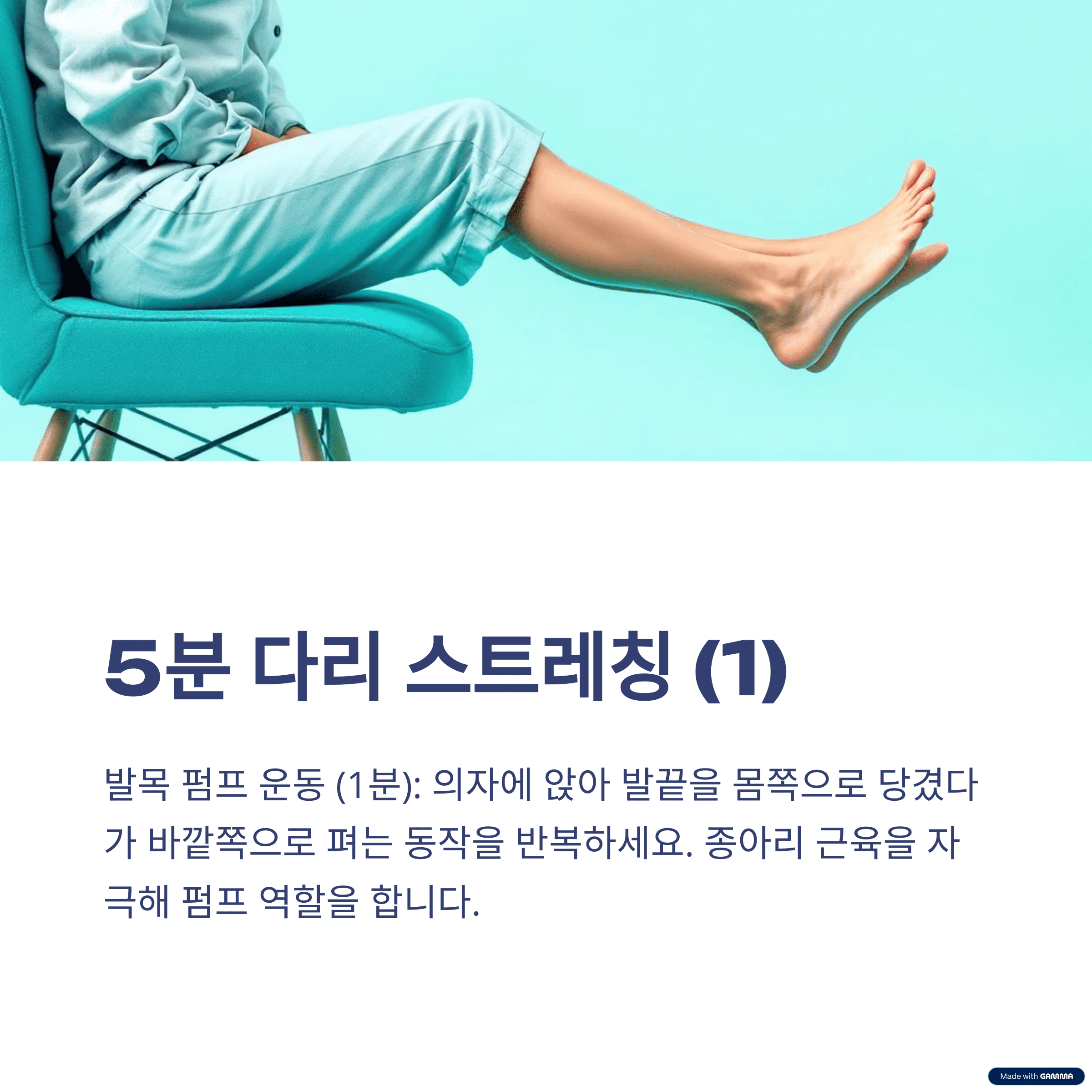 사무실 의자에 앉아서도, 잠들기 전 침대 위에서도 쉽게 따라 할 수 있는 5분 스트레칭입니다. 혈액순환을 촉진해 즉시 다리가 가벼워지는 것을 느낄 수 있습니다.