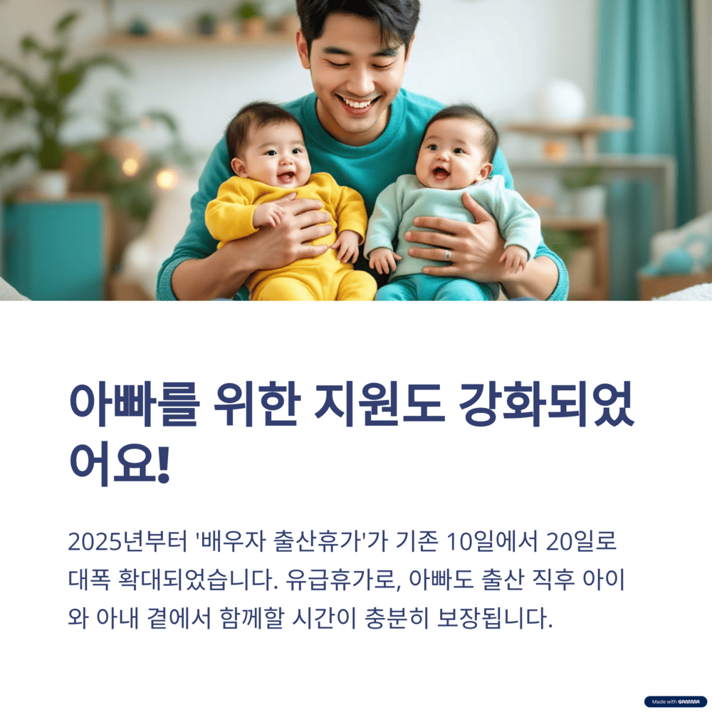 네, 그럼요! 2025년부터 '배우자 출산휴가'가 기존 10일에서 20일로 대폭 확대되었답니다. 유급휴가로, 아빠도 출산 직후 아이와 아내 곁에서 함께할 시간이 충분히 보장되는 거예요. 출산은 엄마 혼자 하는 게 아니라 부부가 함께하는 여정이니, 이 제도를 꼭 활용해서 행복한 시간을 보내시길 바라요!