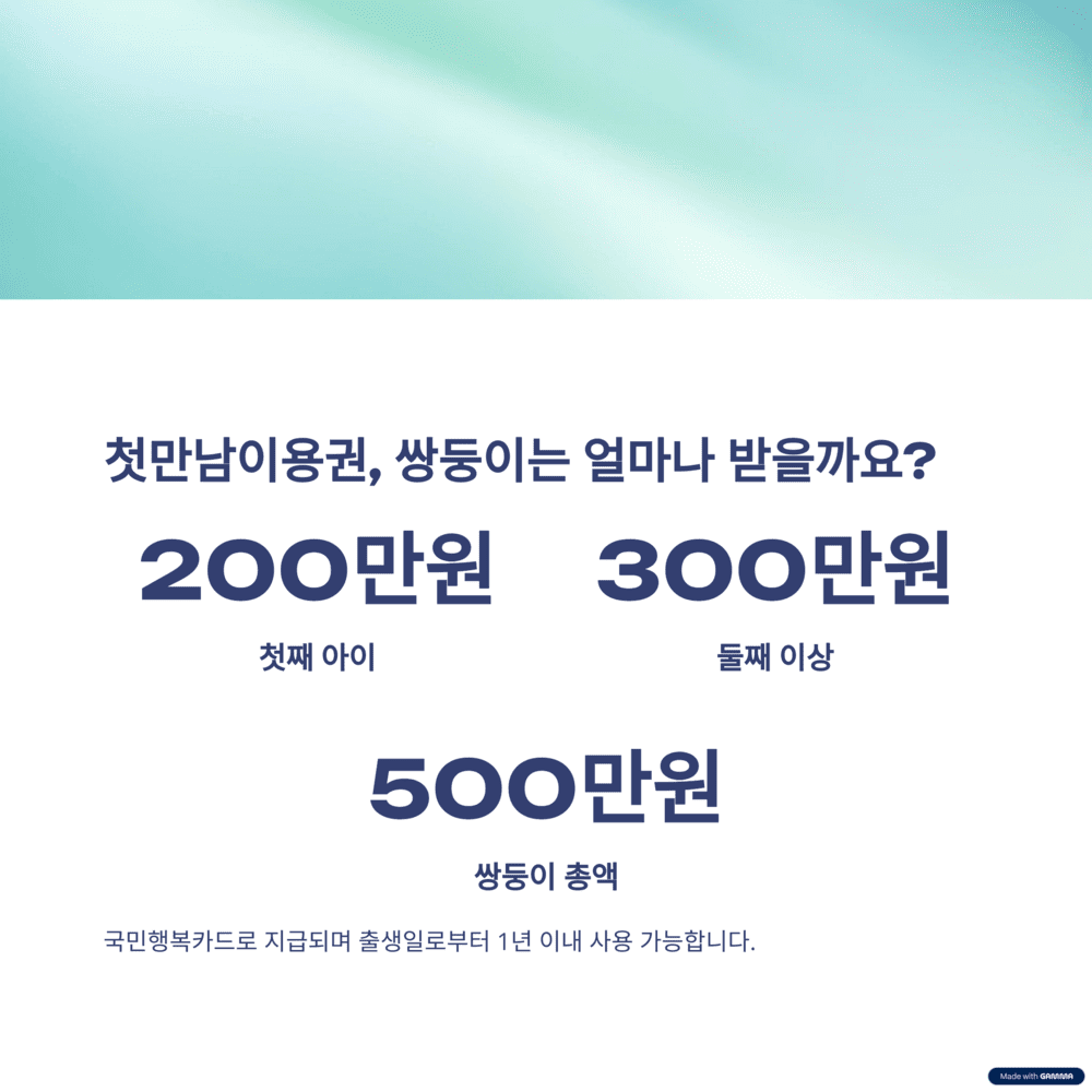 만약 쌍둥이를 출산하셨다면, 한 명은 첫째, 다른 한 명은 둘째로 인정받아 총 500만원(200만원 + 300만원)의 바우처를 받게 된답니다!