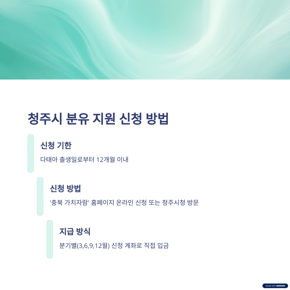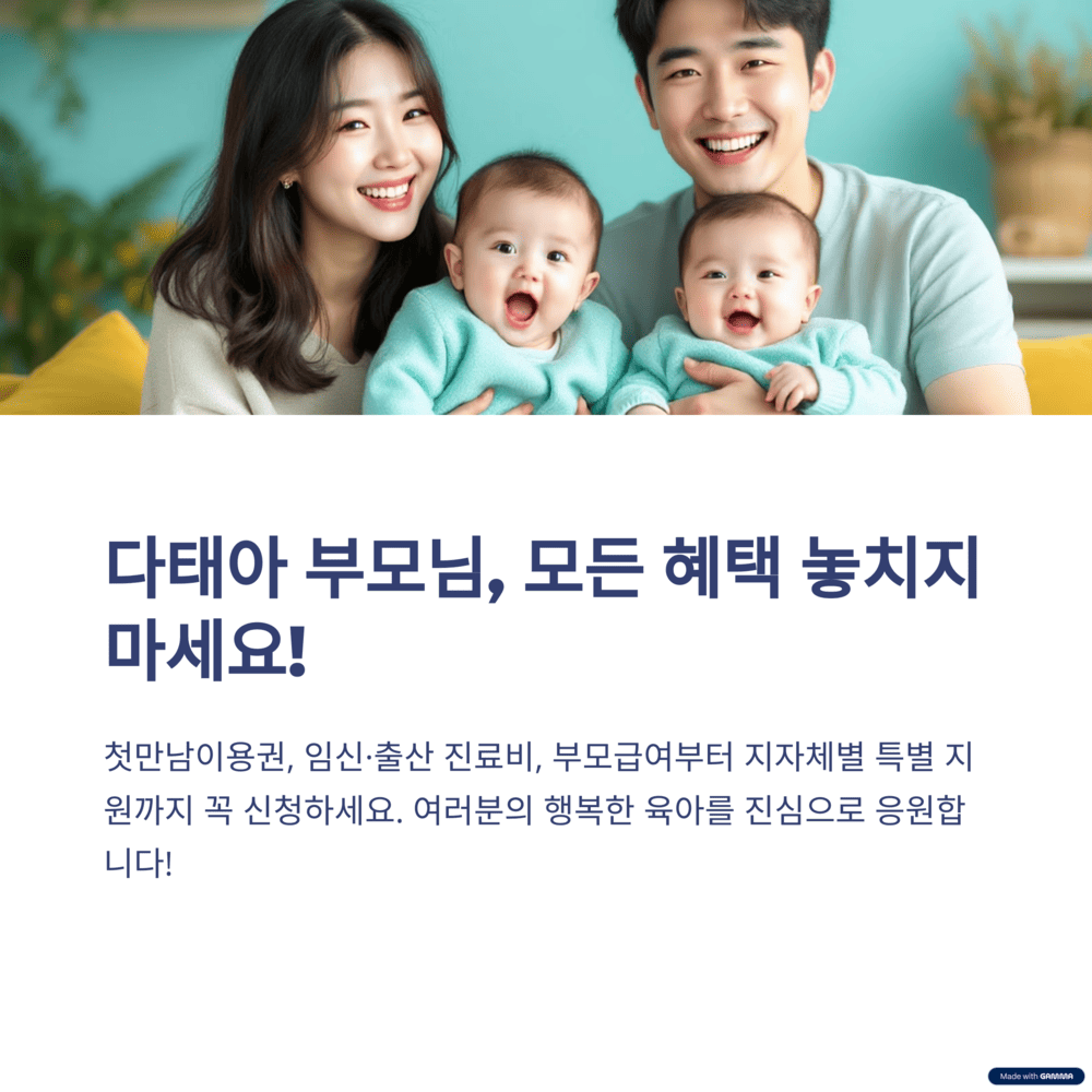 오늘은 2025년 최신 다태아 지원금 정보에 대해 알아보았어요. 전국 공통 혜택인 첫만남이용권, 임신·출산 진료비, 부모급여부터 청주시의 특별한 분유 지원까지 정말 다양하죠?