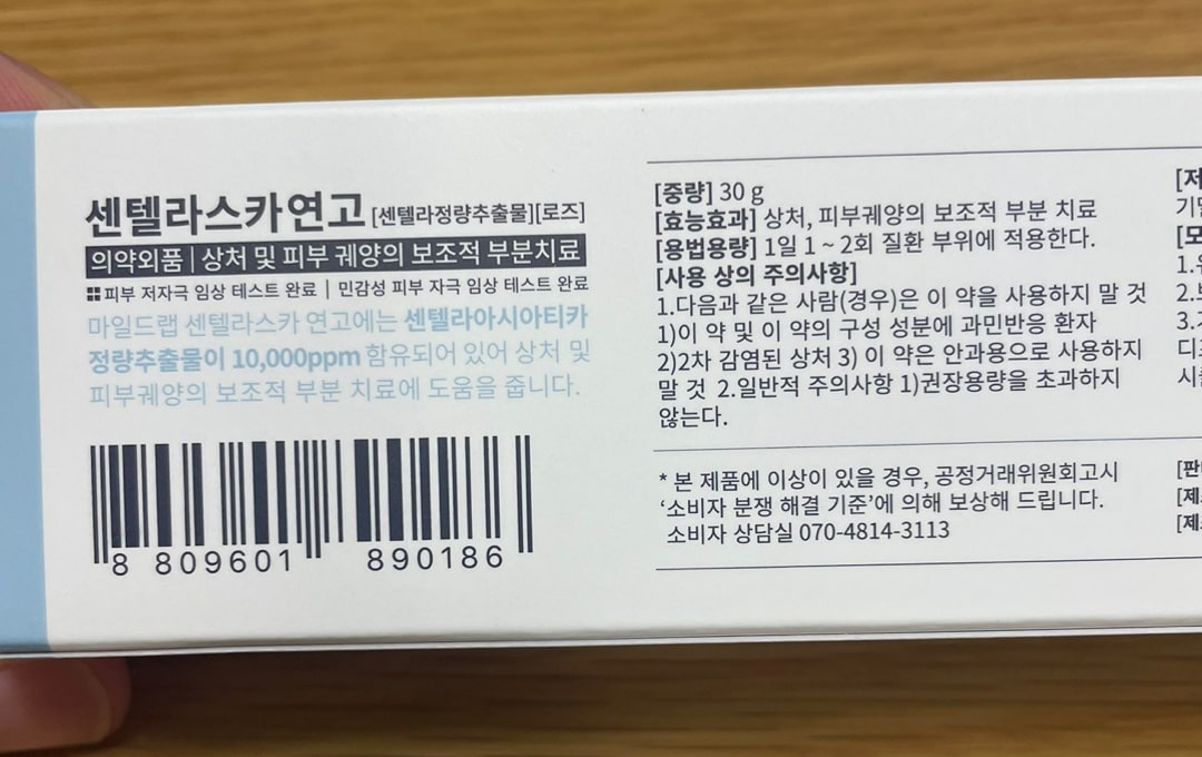 마일드랩 센텔레스카 연고는 의약외품 연고입니다. 약사법으로 관리가 되는 의약외품은 일반화장품과는 달리 질병 치료의 예방에 효능이 있고 의약품보다는 우리 몸에 미치는 효과가 경미하기 때문에 부작용의 우려가 적답니다. 식약처 허가 의약외품이라고 하니까 조금 더 신뢰가 가는 듯한 느낌입니다. 여드름 때문에 압출했거나 피부를 진정시키고 싶을 때 사용하면 좋다고 하네요.