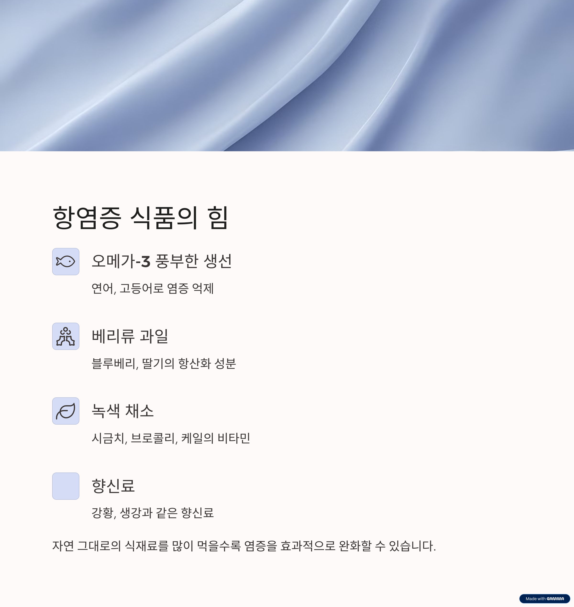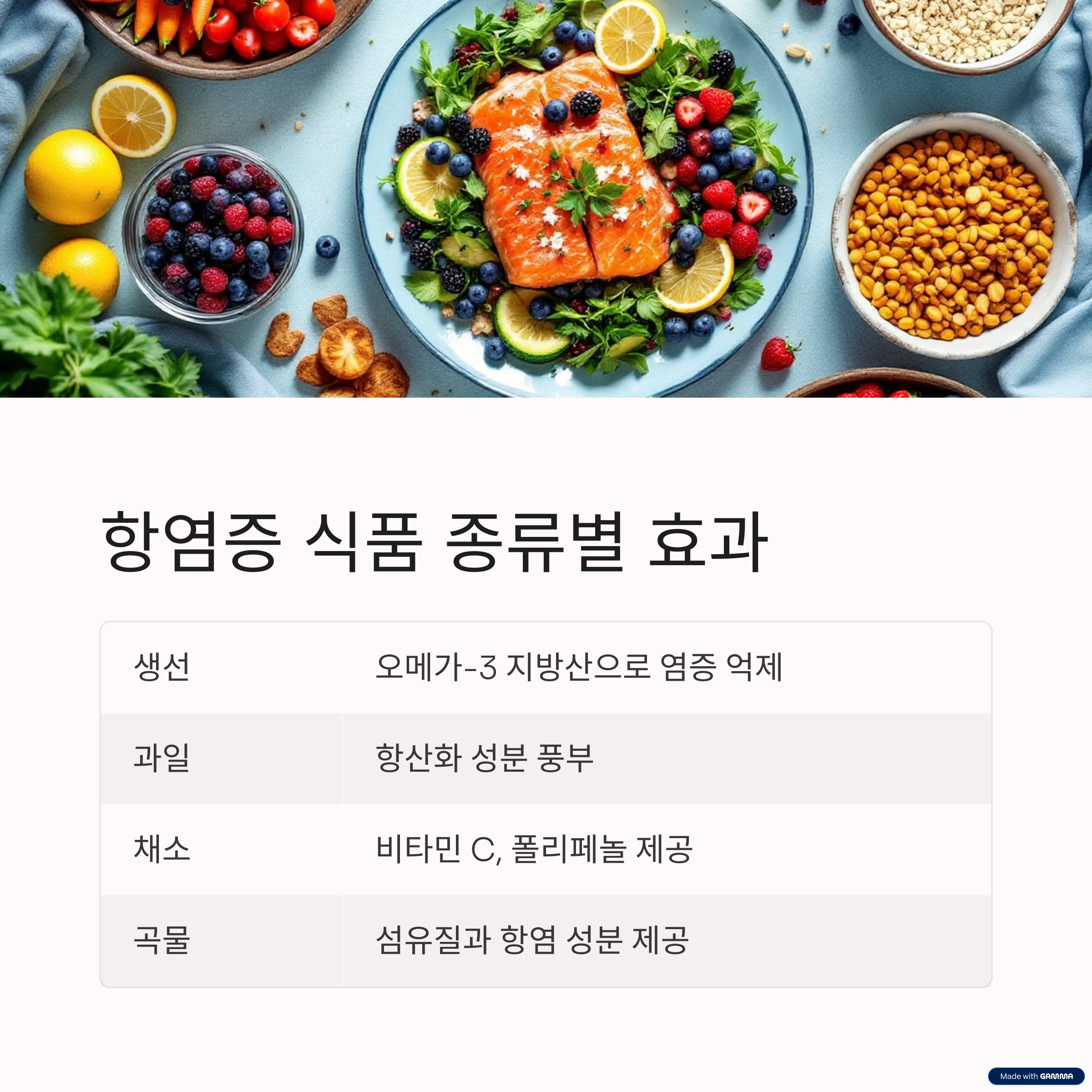 이 표를 참고하여 식단에 꾸준히 포함시키면 염증 완화에 큰 도움이 됩니다.
