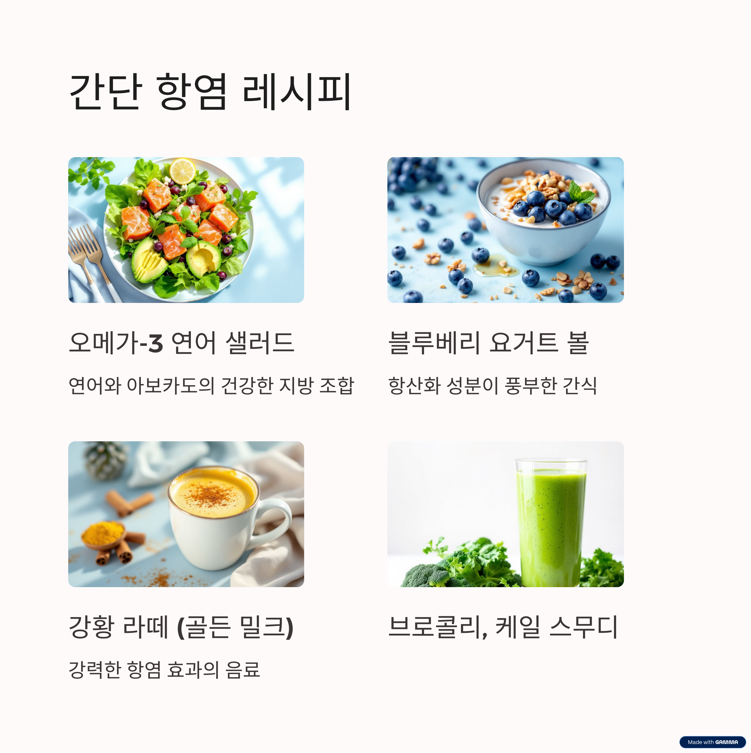 | 생선 | 연어, 고등어, 정어리 | 오메가-3 지방산으로 염증 억제 |