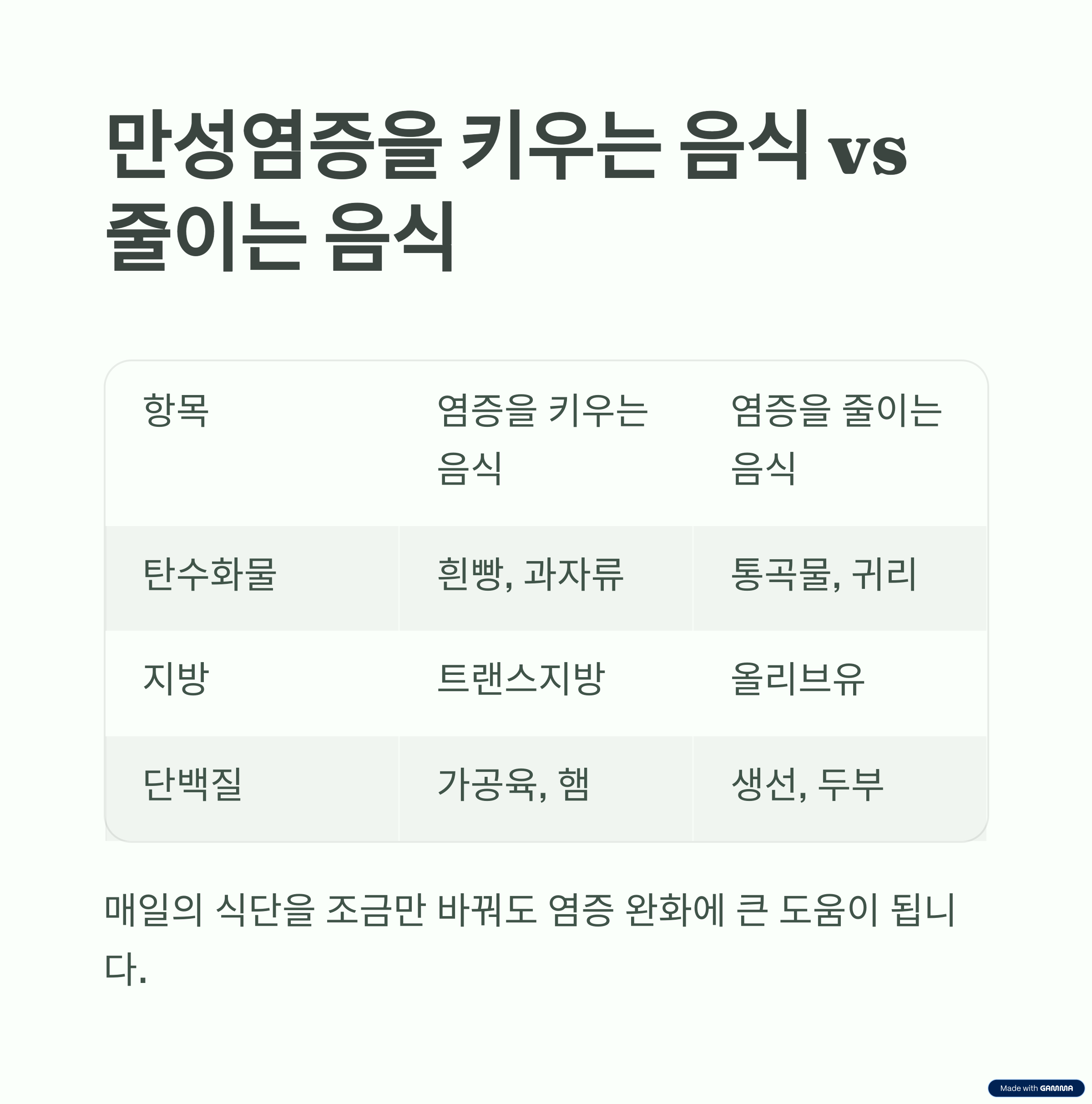 만성염증을 키우는 음식 vs 줄이는 음식 (비교표)