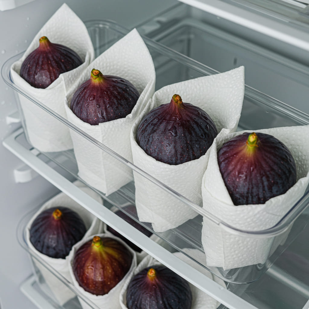 - 키친타월로 감싸기: 무화과는 물에 정말 약해요. 마른 키친타월로 무화과를 하나씩 감싸주어 서로 닿지 않게 하고, 습기를 흡수하도록 해주세요.