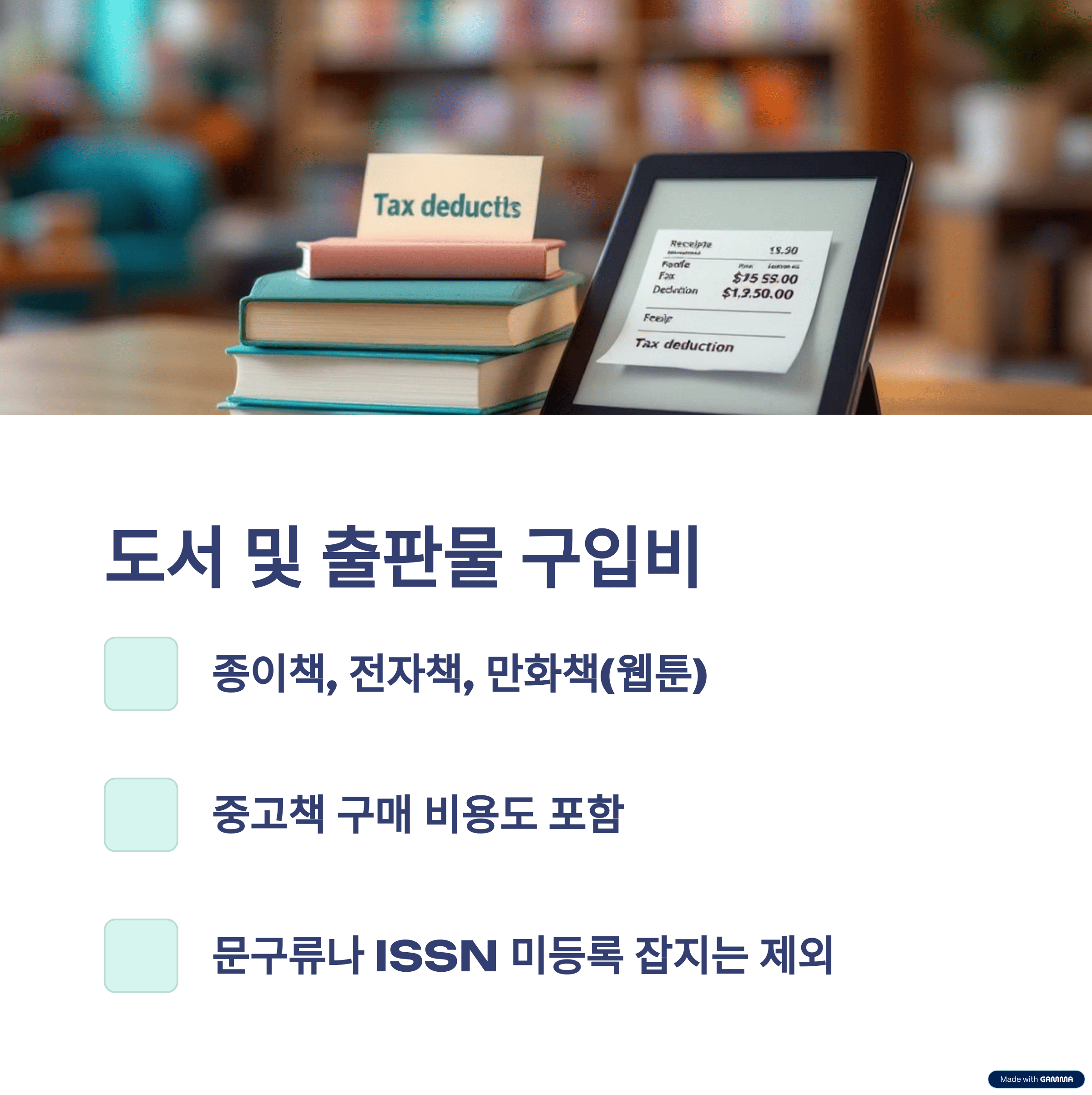 - 도서 및 출판물 구입비: 종이책, 전자책, 만화책(웹툰 포함), 중고책 구매 비용이 모두 포함됩니다. 단, 도서가 아닌 문구류나 잡지(ISSN 미등록)는 제외됩니다. 온라인 서점에서 구매 시에도 당연히 적용됩니다.