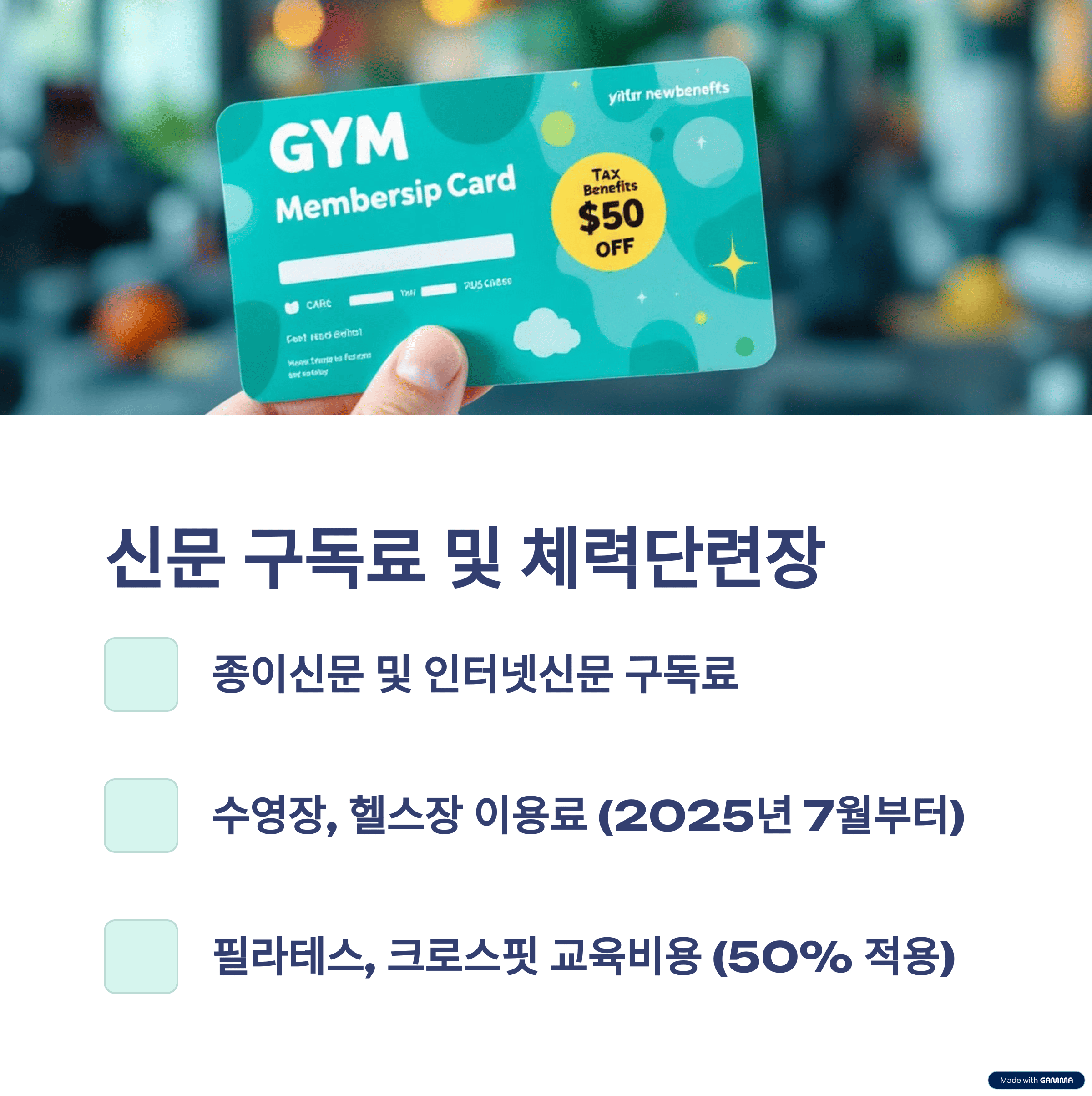 - 수영장 체력단련장: 2025년 7월부터 적용되는 새로운 항목이에요. 이제부터 헬스장, 필라테스, 크로스핏 교육비용도 가능하니 참고하세요.