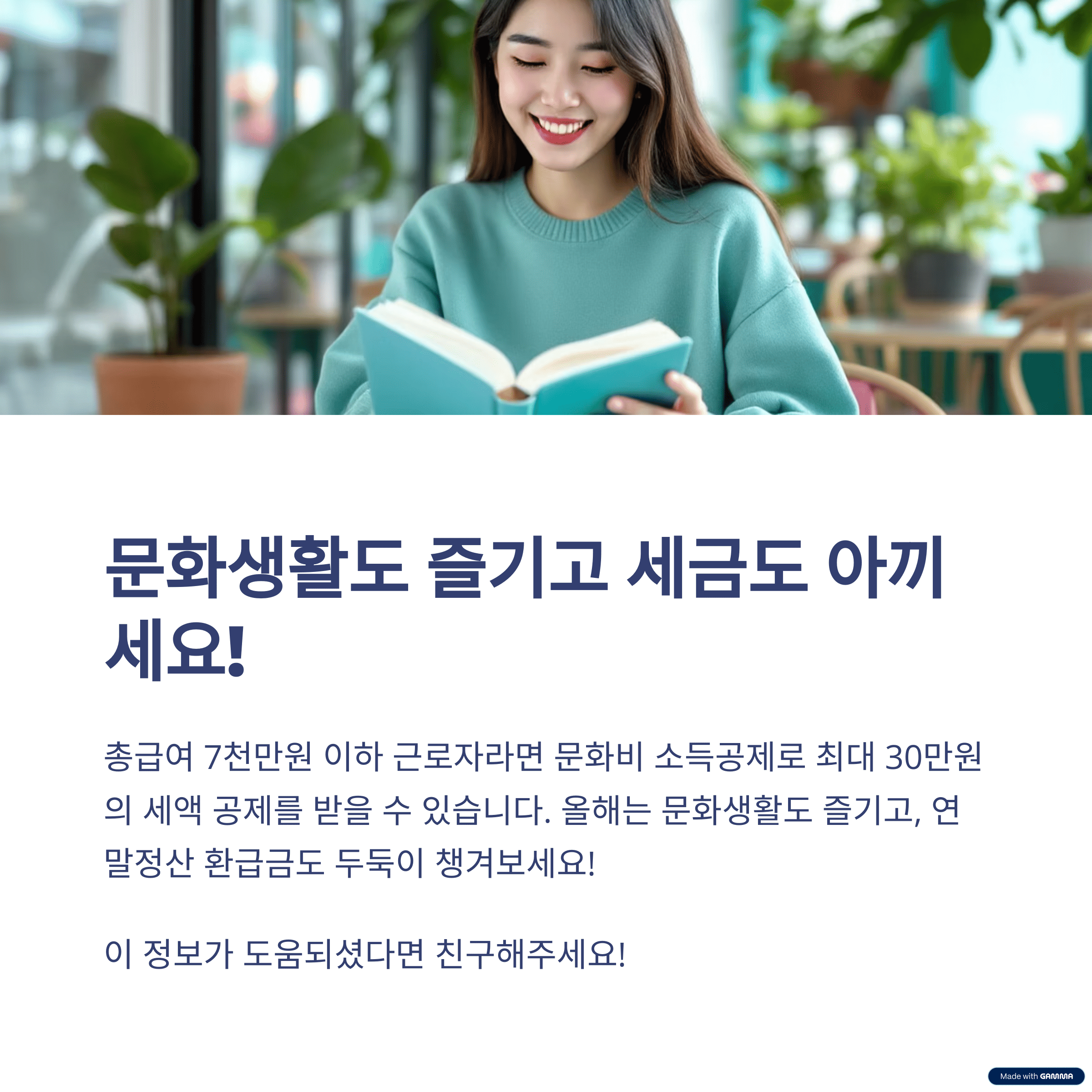 지금까지 문화비 소득공제의 모든 것을 알아보았습니다. 요약하자면, 총급여 7천만원 이하 근로자가 등록된 가맹점에서 도서, 공연, 박물관/미술관, 신문에 지출하면 30%의 높은 공제율과 최대 100만원의 추가 공제 혜택을 받을 수 있다는 것입니다. 복잡해 보이지만 사실은 국세청에서 알아서 챙겨주는 편리한 제도이니, 우리는 조건에 맞게 현명하게 소비하기만 하면 됩니다.