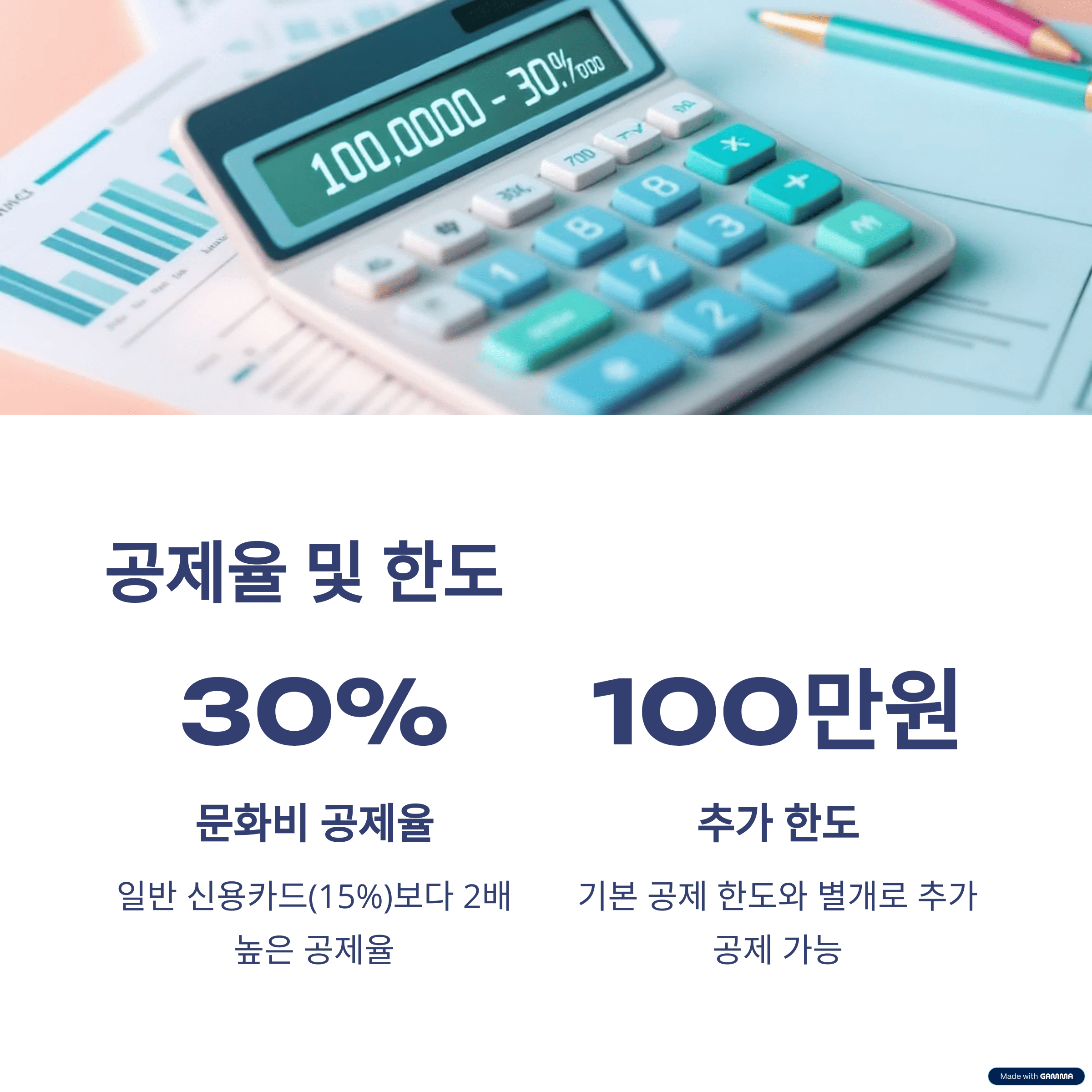 문화비 소득공제의 가장 큰 매력은 바로 높은 공제율과 추가 한도입니다. 일반적인 신용카드 공제율(15%)보다 2배 높은 30%의 공제율이 적용됩니다. 이는 현금영수증 및 체크카드 공제율과 동일한 수준입니다.