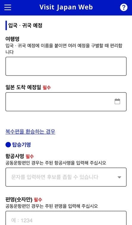 여행명(예: 2025 오사카 가족여행)을 입력하고 일본 도착일, 항공사, 편명, 일본 내 체류지(호텔) 주소 및 연락처를 기입합니다.