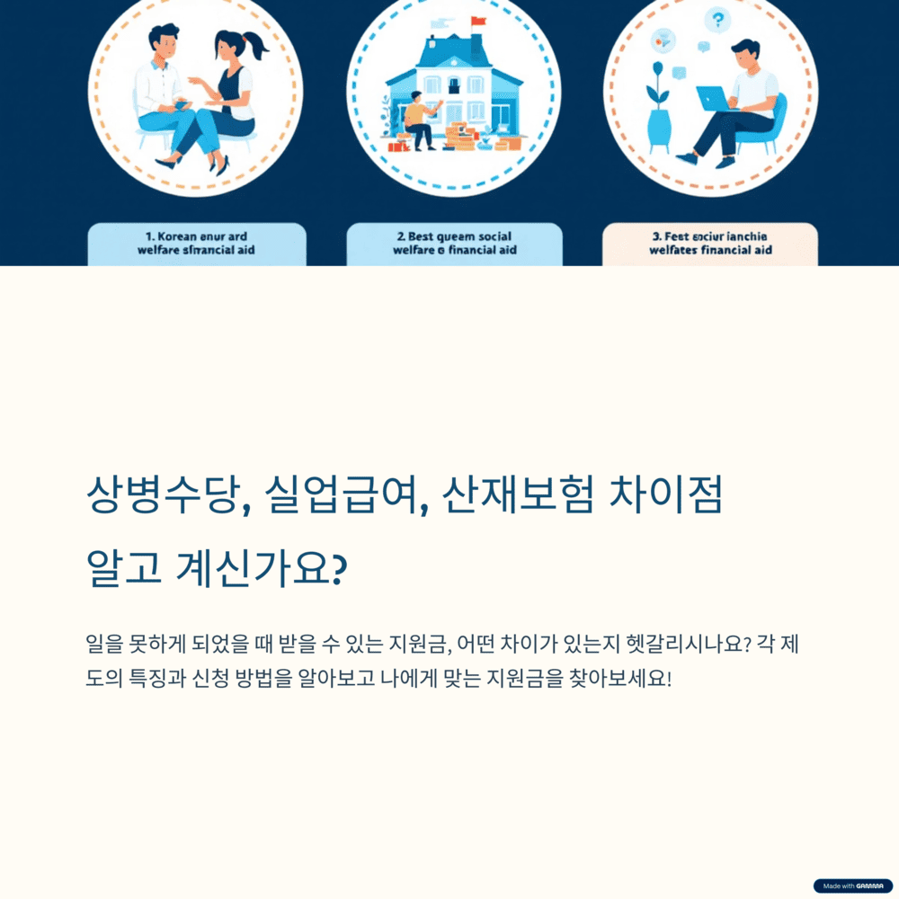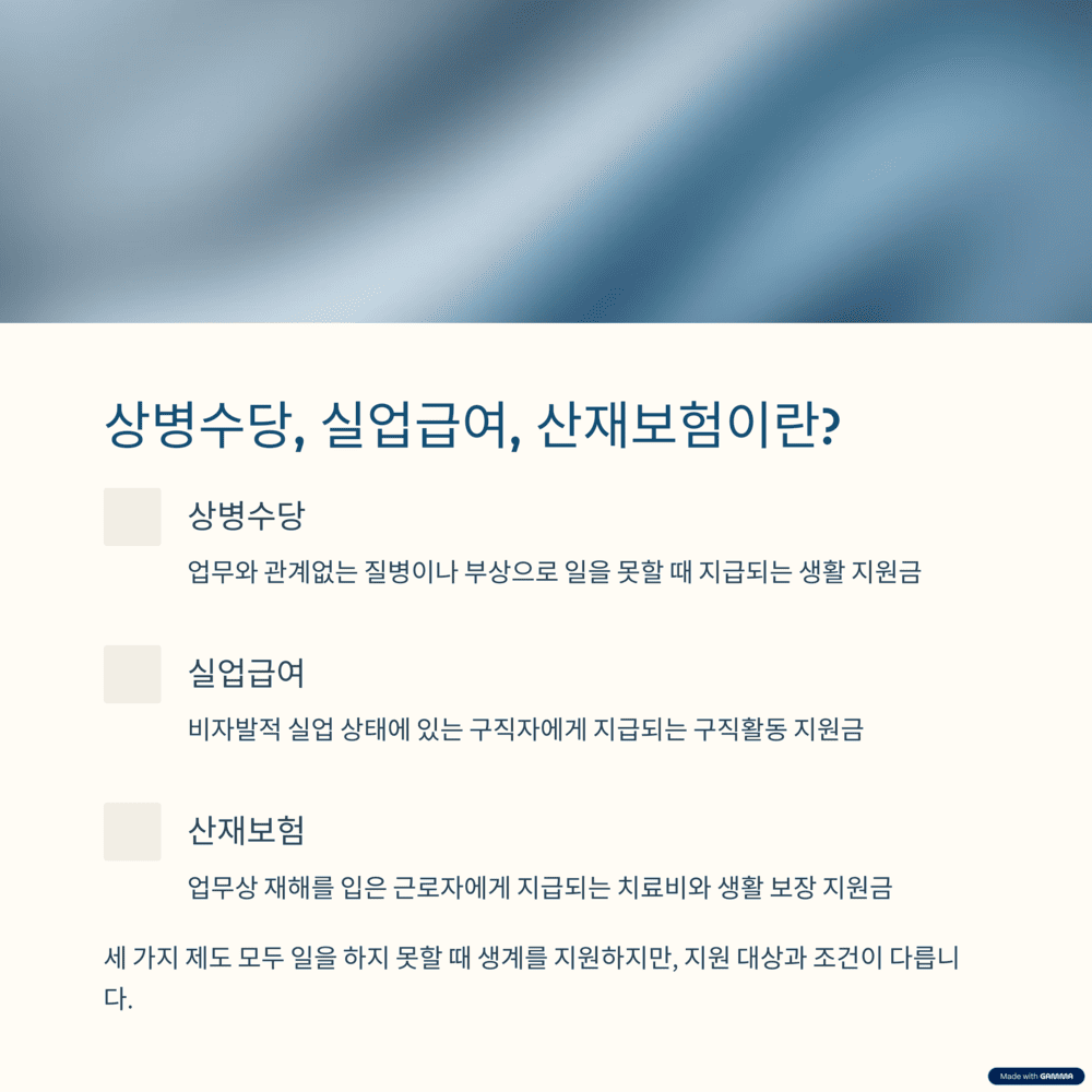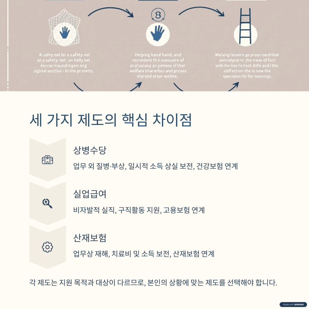 1. 한눈에 비교! 상병수당 vs 실업급여 vs 산재보험 핵심 총정리 (비교표)
