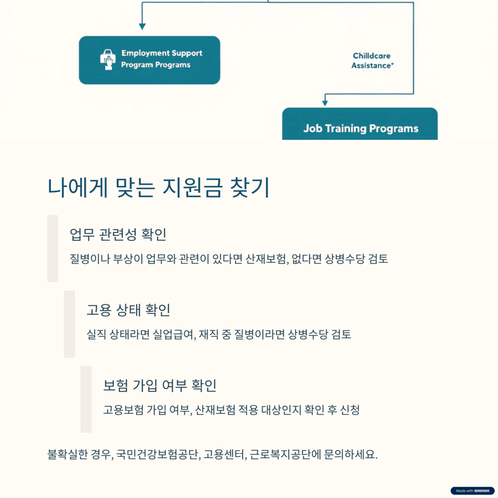 심지어 출퇴근길에 발생한 사고도 업무상 재해로 인정된답니다. 상병수당과 헷갈릴 수 있지만, '업무 관련성' 여부가 가장 결정적인 차이점이에요.