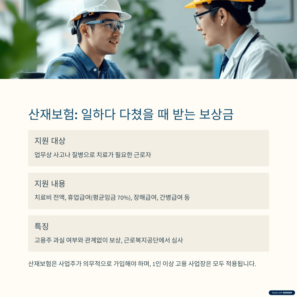 산재보험의 정식 명칭은 '산업재해보상보험'으로, '업무상 재해'를 입은 근로자를 보호하기 위한 가장 강력한 제도예요. '업무상'이라는 조건만 충족되면, 치료비는 물론이고 일을 못 하는 기간 동안의 생활비(휴업급여)까지 지원받을 수 있어요.