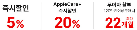 즉시할인 5% 혜택, 애플케어 + 즉시할인 20% 그리고 120만원 이상 구매시에