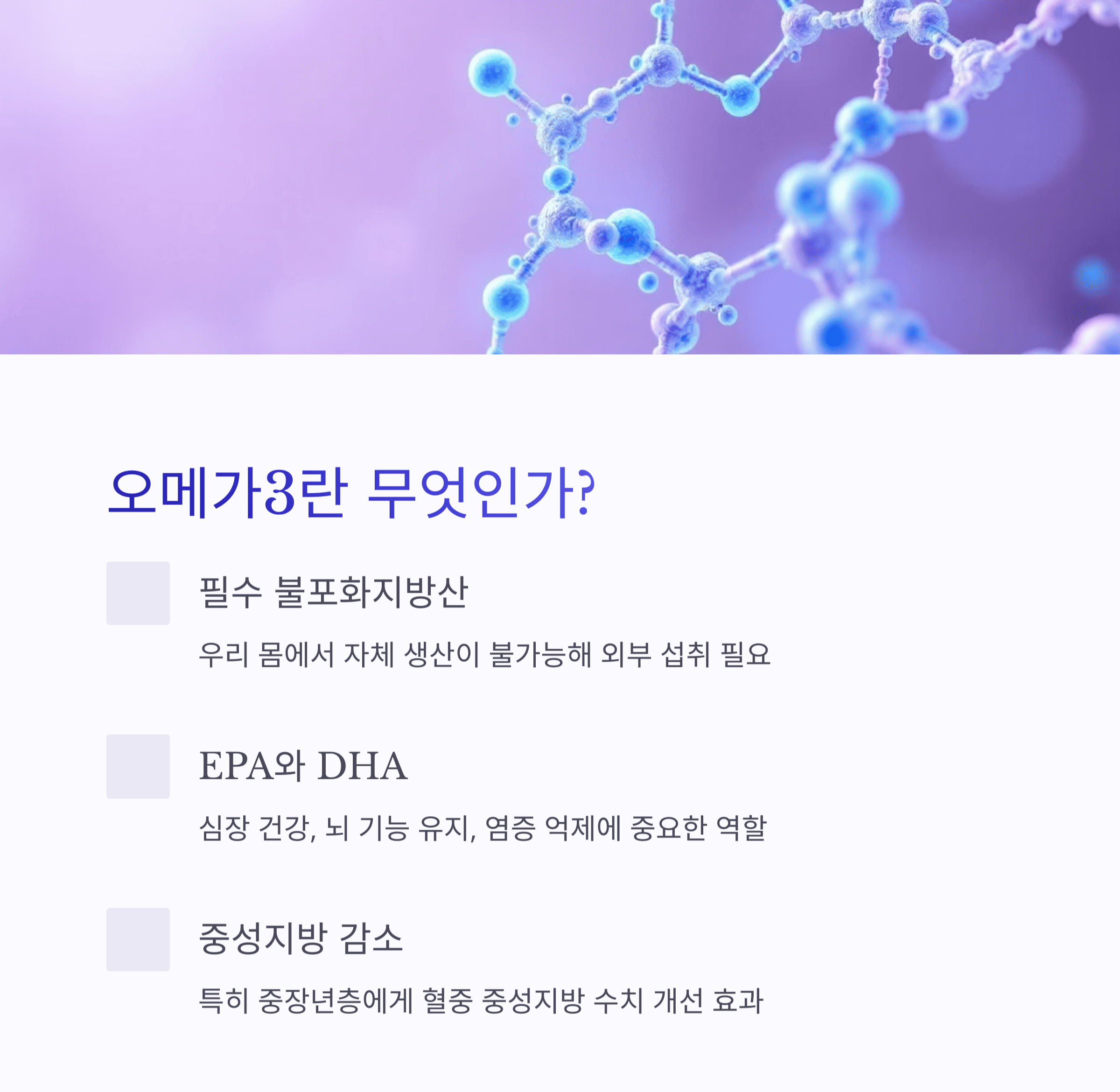 오메가3는 불포화지방산의 한 종류로, 우리 몸에서 자체적으로 만들어내지 못하기 때문에 외부에서 섭취해야 해요.