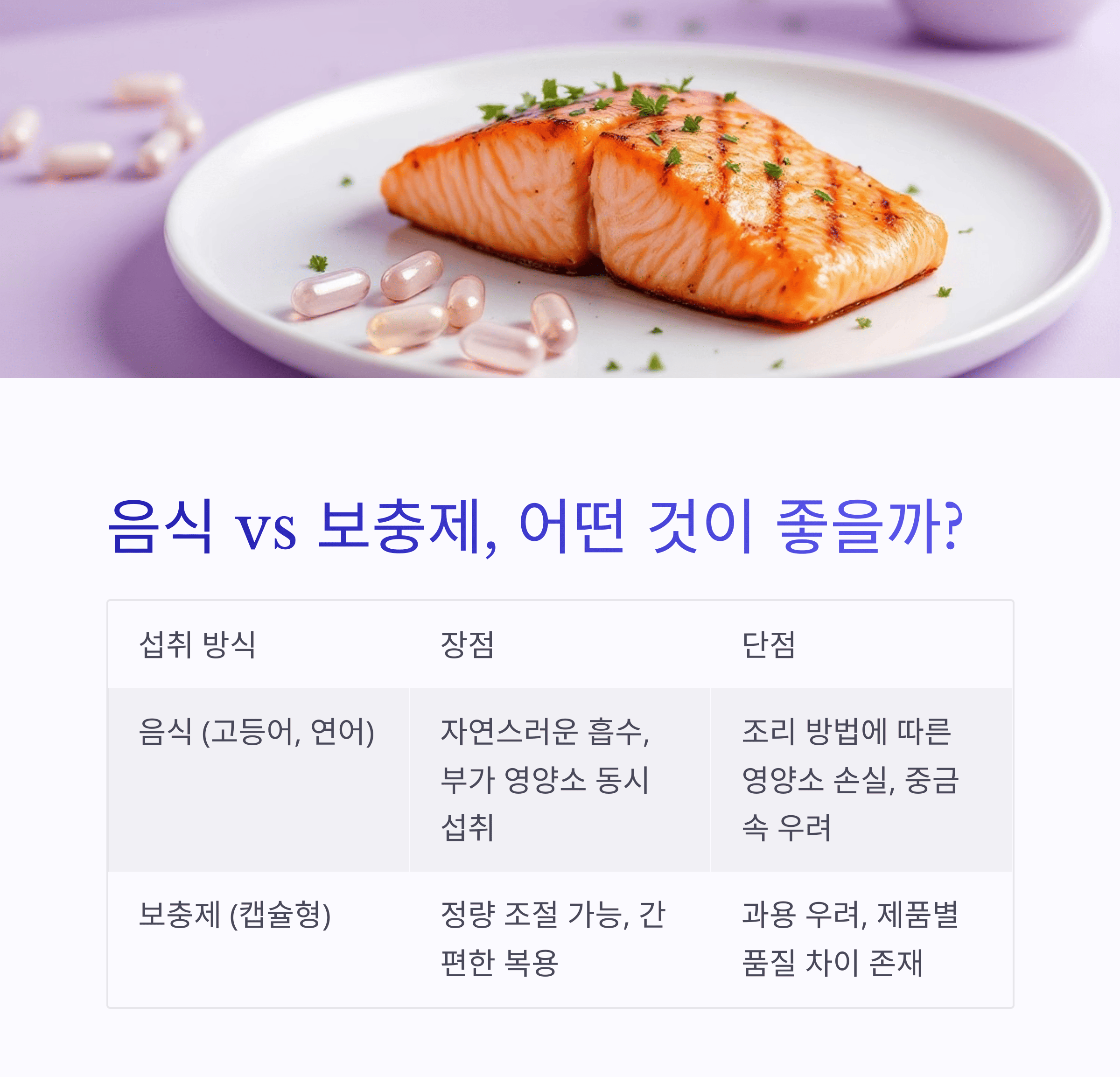음식 (고등어, 연어 등) 자연스러운 흡수, 부가 영양소 동시 섭취 조리 방법 따라 영양소 손실, 중금속 우려