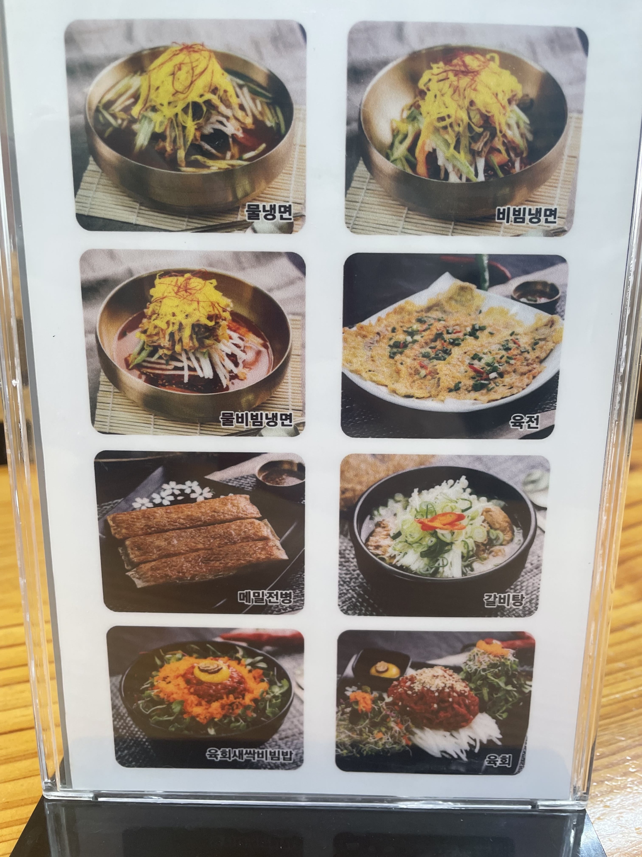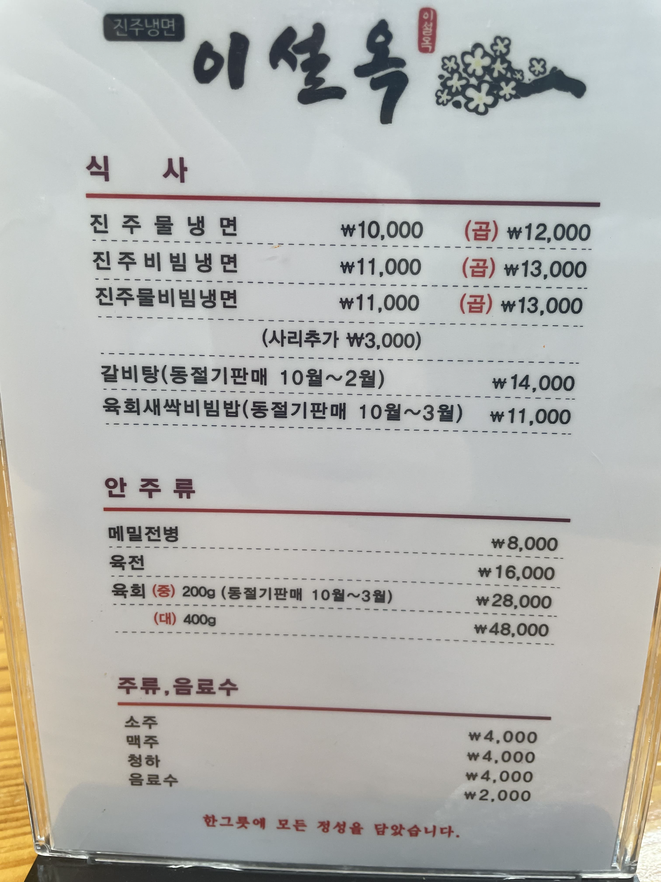 청주 냉면맛집 이설옥의 메뉴는 진주물냉면과 비빔냉면, 그리고 물비빔냉면과 육전, 메밀전명, 육회가 있어요.