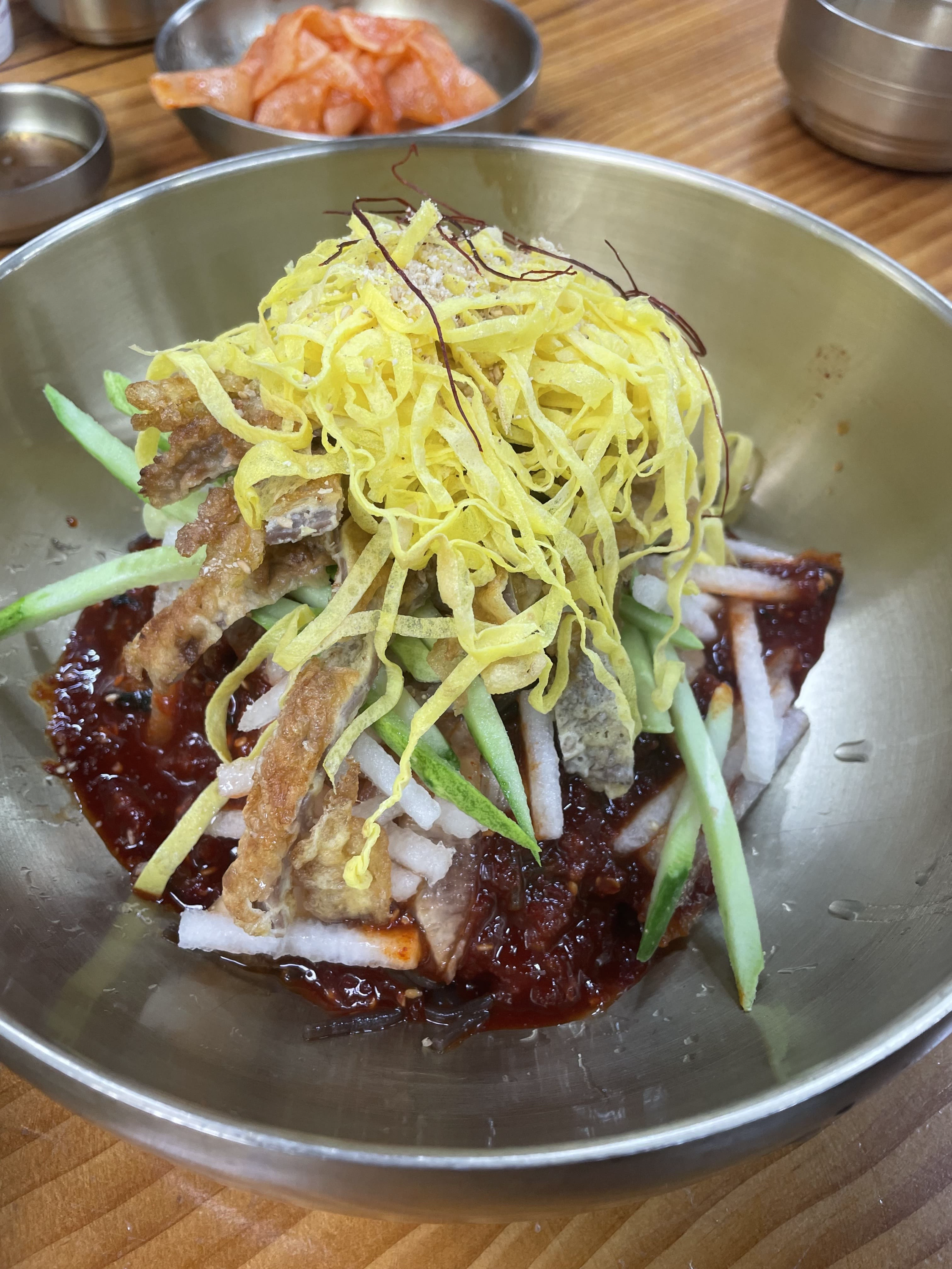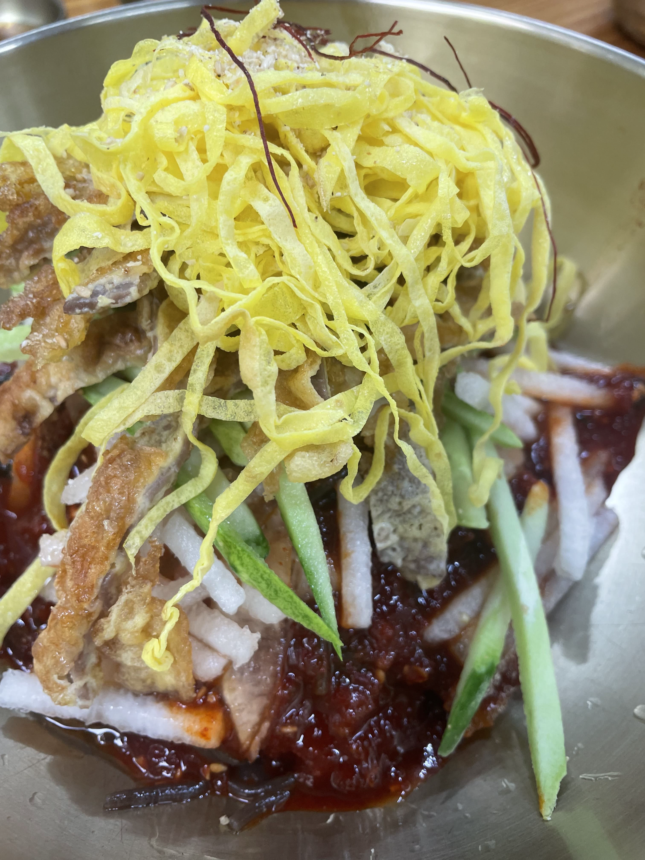 푸짐한 고명 보이시나요? 육전 외에도 쫄깃한 면발 위로 오이, 배, 계란지단, 무절임 등등 푸짐하게 올라가있어요. 엄마가 엄청 푸짐하다고 말씀하시더라구요.