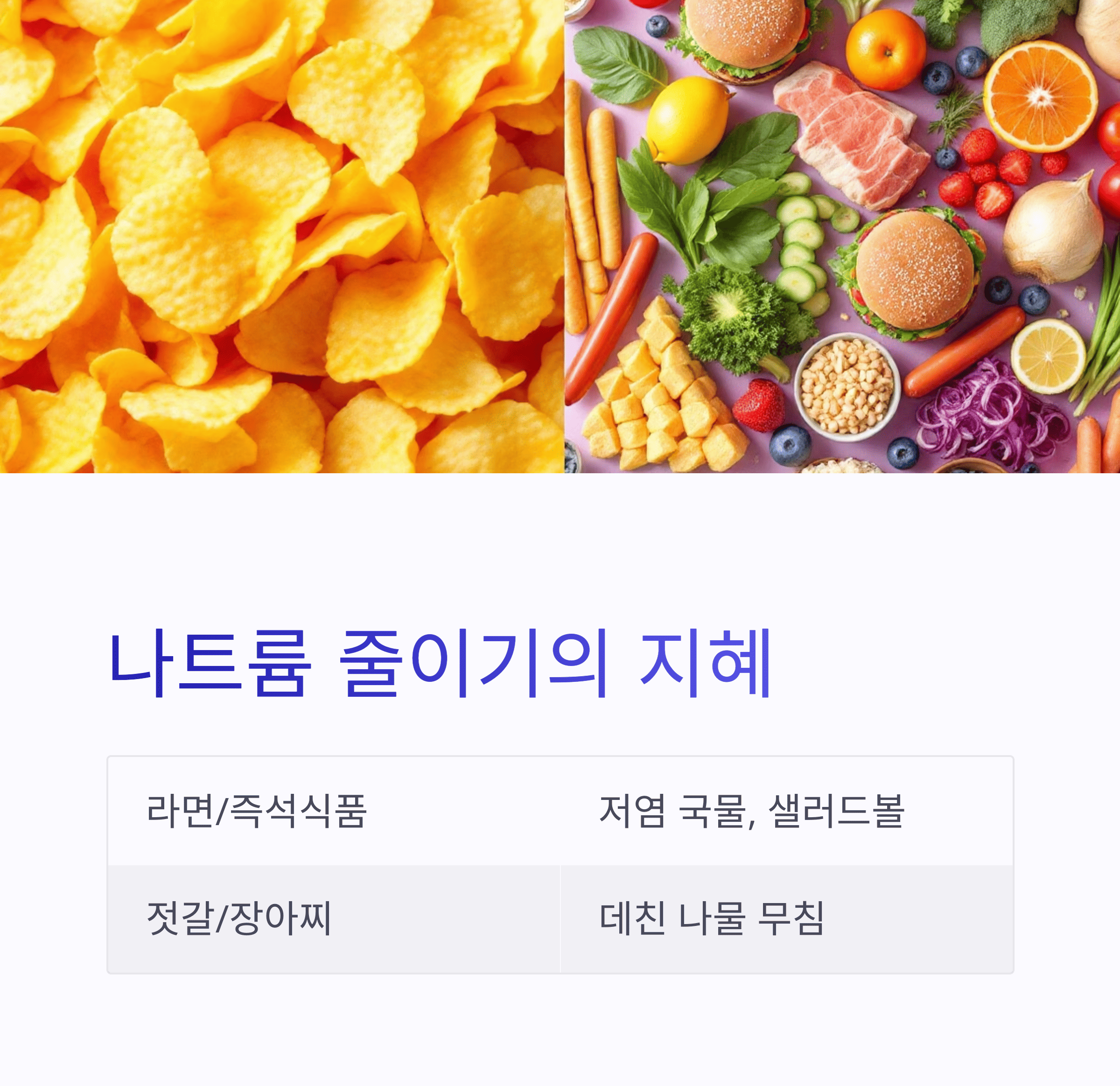 | 라면/즉석식품 | 나트륨 과다 (1,500mg 이상) | 저염 국물, 샐러드볼 |