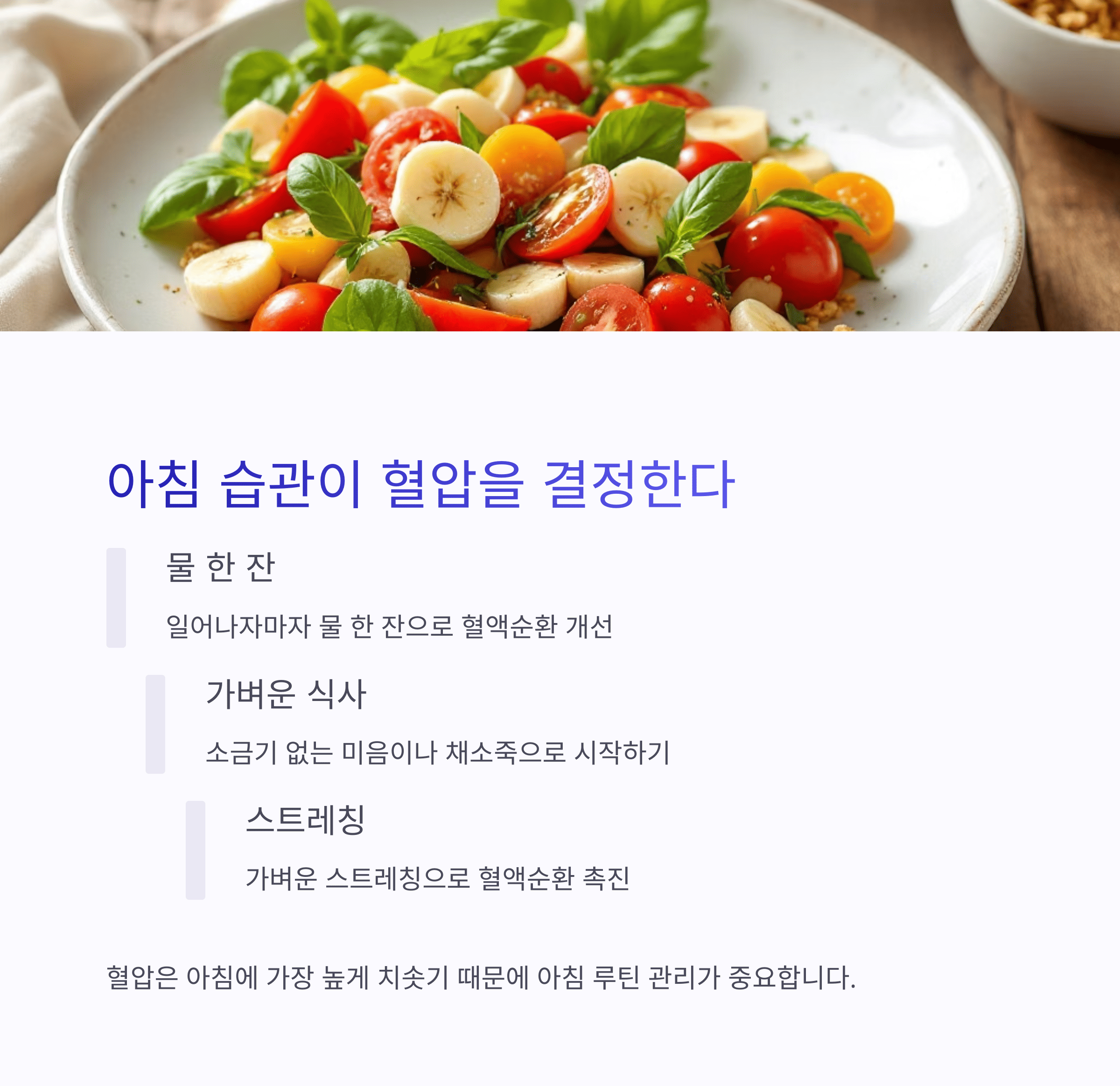 특히 고혈압 약을 먹지 않는 분들이라면, 아침 첫 식사의 선택이 하루 전체 혈압에 영향을 줄 수 있어요.