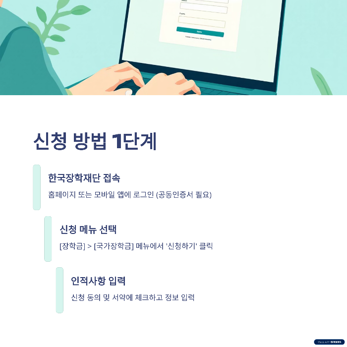 - 한국장학재단 홈페이지 또는 모바일 앱 접속 및 로그인