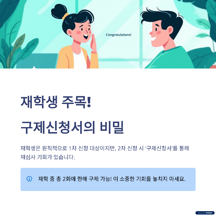 2차에 신청한 재학생은 '신청기간 미준수'로 탈락 처리되지만, '구제신청서'를 제출하면 재심사를 받을 수 있습니다. 신청현황 메뉴에서 구제신청서가 자동으로 적용되었는지 꼭 확인하세요.