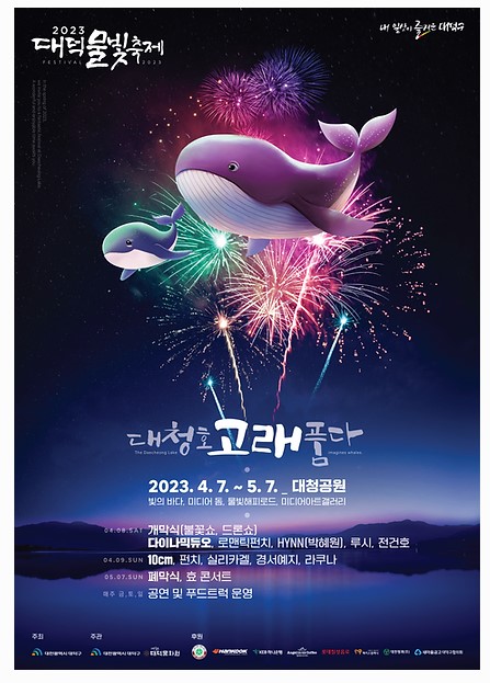 2023 대청호 대덕뮤직페스티벌은 4.8(토) ~ 4.9(일)까지이며 장소는 대청공원에서 열립니다. 개막식은 4월 8일 토요일 불꽃쇼와 드론쇼를 시행하며 4월 8일(토)에는 다이나믹듀오, 로맨틱펀치, HYNN(박혜원), 루시, 진건호가 출연하며 4월 9일(일)에는 10CM, 펀치, 실리카겔, 경서예지, 라쿠나가 출연합니다.
