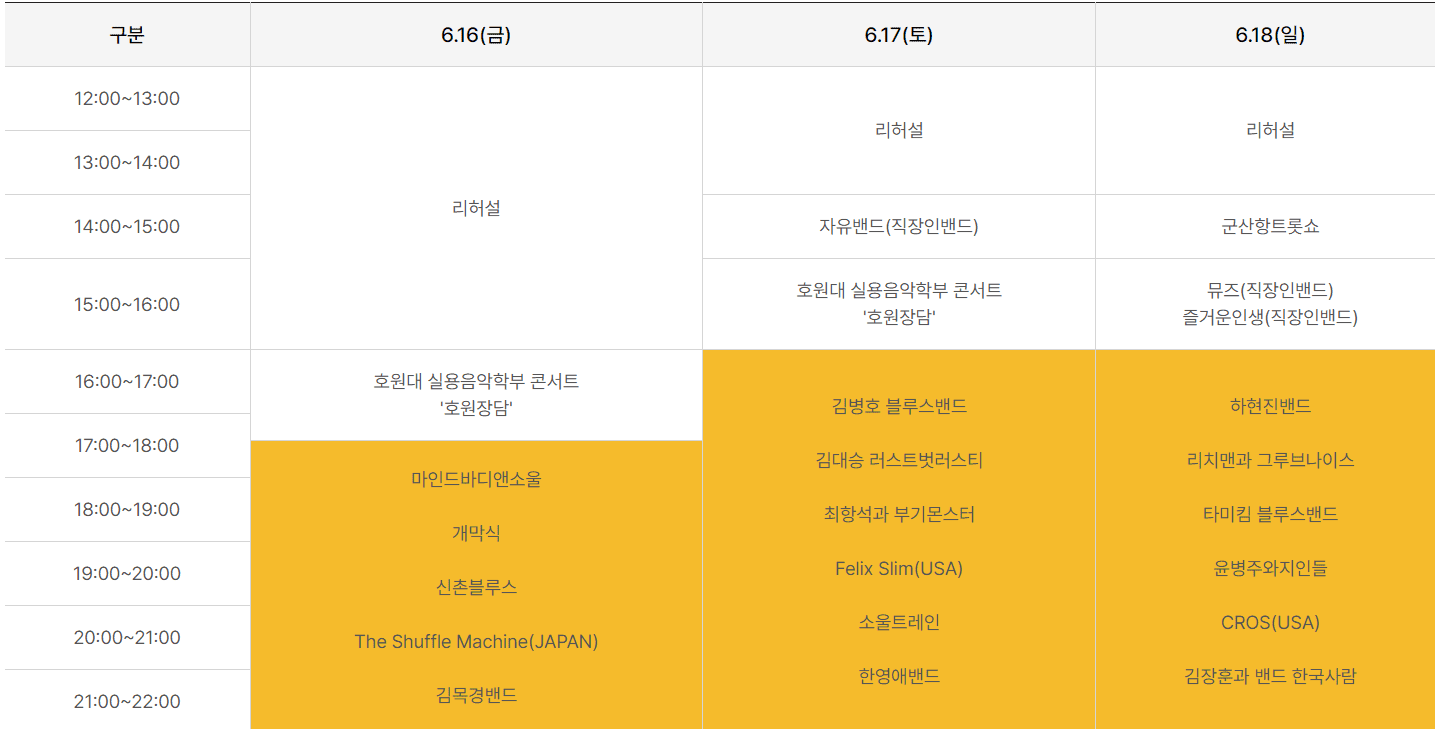 이번 군산 수제맥주 블루스 페스티벌의 타임테이블은 아래와 같습니다.