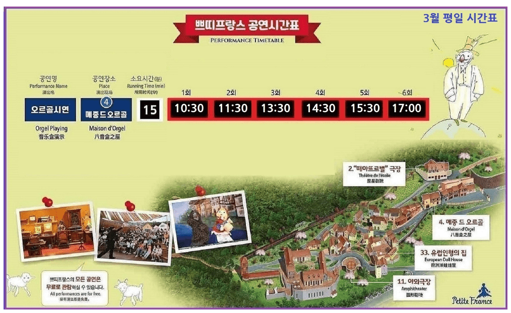 쁘띠프랑스에서 진행되는 세계오르골페스티벌은 세계오르골 시연과 서커스마임쇼, 벌룬 퍼포먼스 등 버라이어티 퍼포먼스공연이 진행됩니다. 어린왕자를 느낄 수 있는 생텍쥐페리 기념관과 체험존이 있어 다양한 체험을 할 수 있고 오르골하우스를 리뉴얼하여 개장했기 때문에 새로움을 느끼실 수 있답니다.