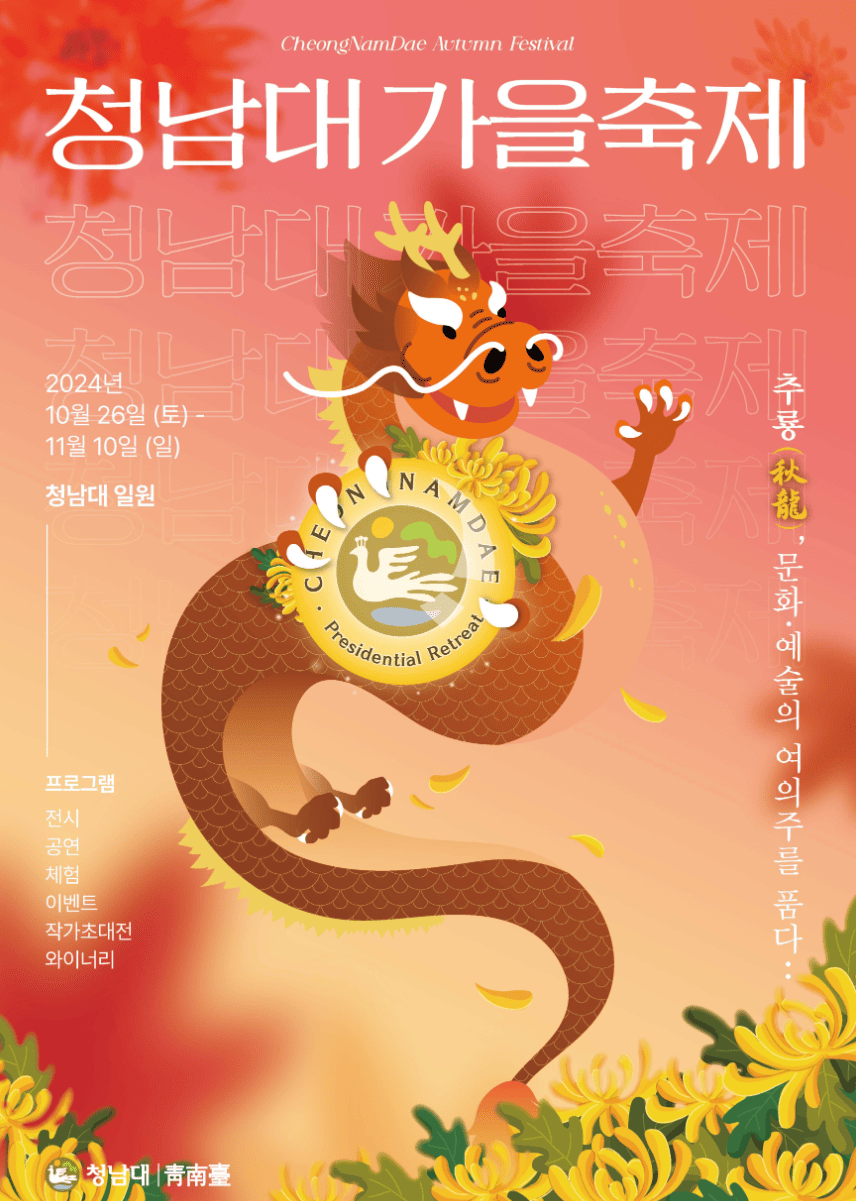 이번 2024 청남대 가을축제는 자연과 문화가 어우러진 힐링 공간에서 단풍과 국화 사이에서 특별한 추억을 만들 수 있는 기회예요. 가족, 연인과 함께 이번 가을을 청남대에서 만끽해 보세요!