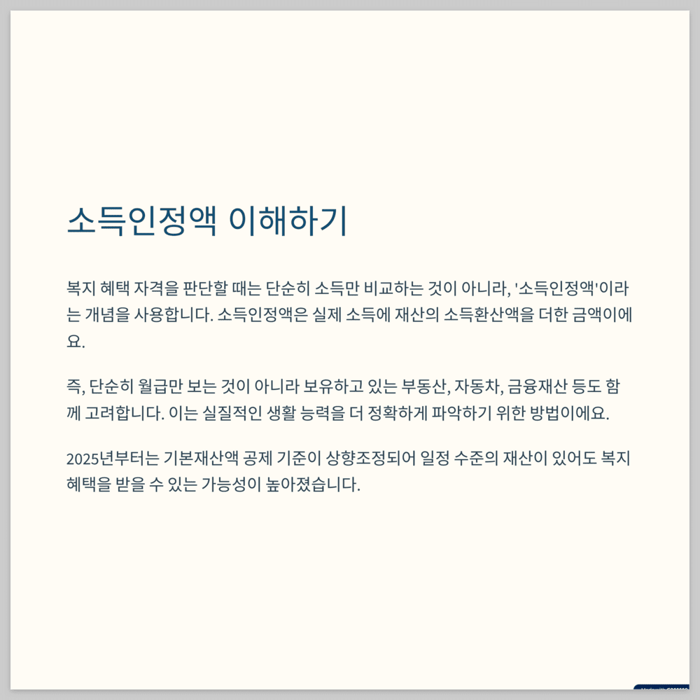 소득인정액은 실제 소득에 재산의 소득환산액 을 더한 금액이에요. 즉, 단순히 월급만 보는 것이 아니라 보유하고 있는 부동산, 자동차, 금융재산 등도 함께 고려한다는 뜻이죠. 이는 실질적인 생활 능력을 더 정확하게 파악하기 위한 방법이에요.
