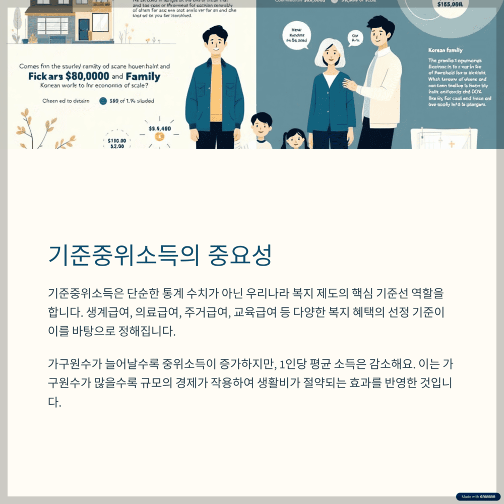 4인 가구 기준으로 월 609만 7천원이라는 것은, 이 금액이 우리나라 4인 가구 소득의 정확히 중간값이라는 의미예요. 즉, 절반의 가구는 이보다 많이 벌고, 절반의 가구는 이보다 적게 번다는 뜻이죠. 이 기준을 바탕으로 각종 복지 혜택의 소득 기준선이 정해져요.