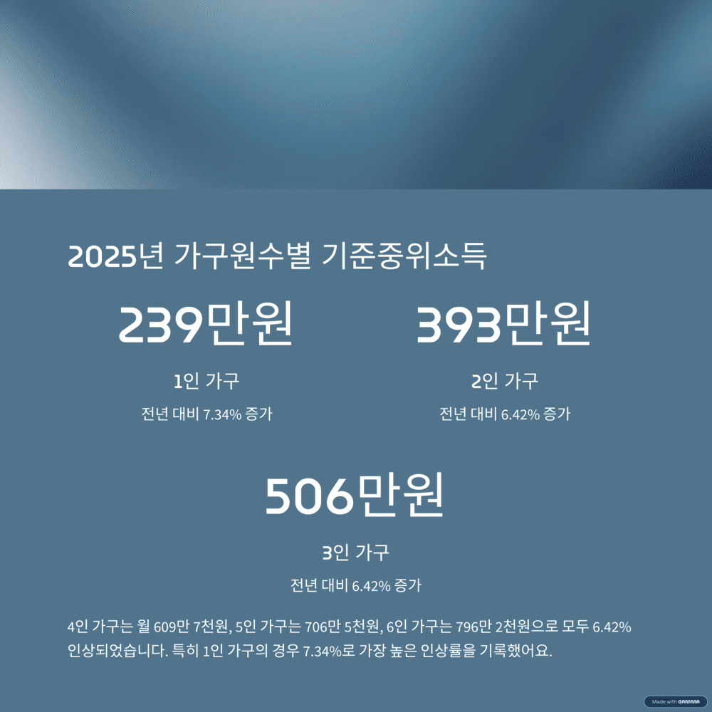 위 표에서 보시는 것처럼, 2025년 기준중위소득은 모든 가구원수에서 상당한 인상폭을 보이고 있어요. 특히 1인 가구의 경우 7.34%로 가장 높은 인상률을 기록했는데, 이는 1인 가구의 생활비 부담이 상대적으로 높다는 점을 반영한 결과랍니다.