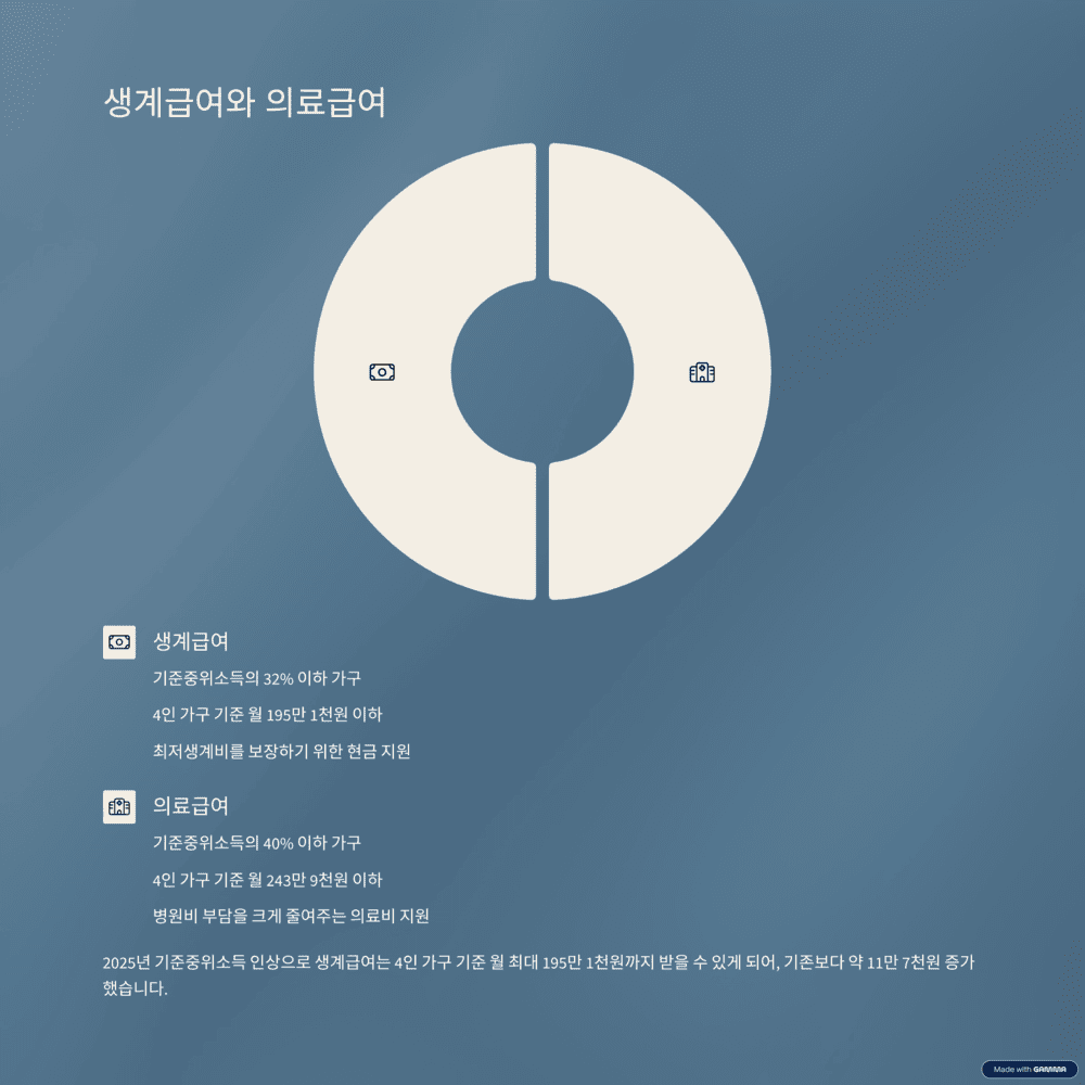 - 의료급여: 기준중위소득의 40% 이하 가구가 대상이며, 4인 가구 기준으로 월 243만 9천원 이하 소득 가구예요. 병원비 부담을 크게 줄여주는 의료비 지원 혜택을 받을 수 있답니다.