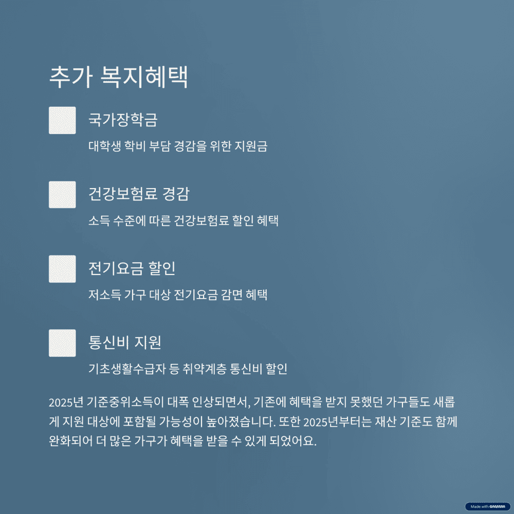 이 외에도 기준중위소득은 국가장학금, 건강보험료 경감, 전기요금 할인, 통신비 지원 등 다양한 복지 혜택의 기준이 돼요. 특히 2025년 기준중위소득이 대폭 인상되면서, 기존에 혜택을 받지 못했던 가구들도 새롭게 지원 대상에 포함될 가능성이 높아졌어요.